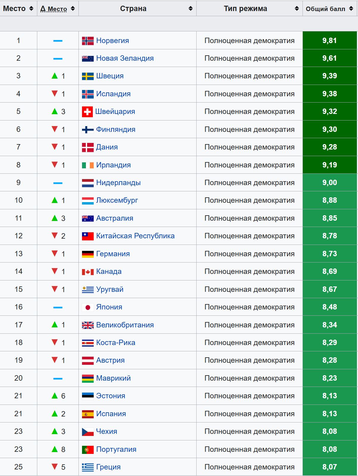 Весь список из 25 стран с "полной демократией" (балл 8 и выше) включает 11 монархий, при этом США, Франция, Италия и все страны Восточной Европы (кроме Эстонии и Чехии) лишены статуса "полная демократия".