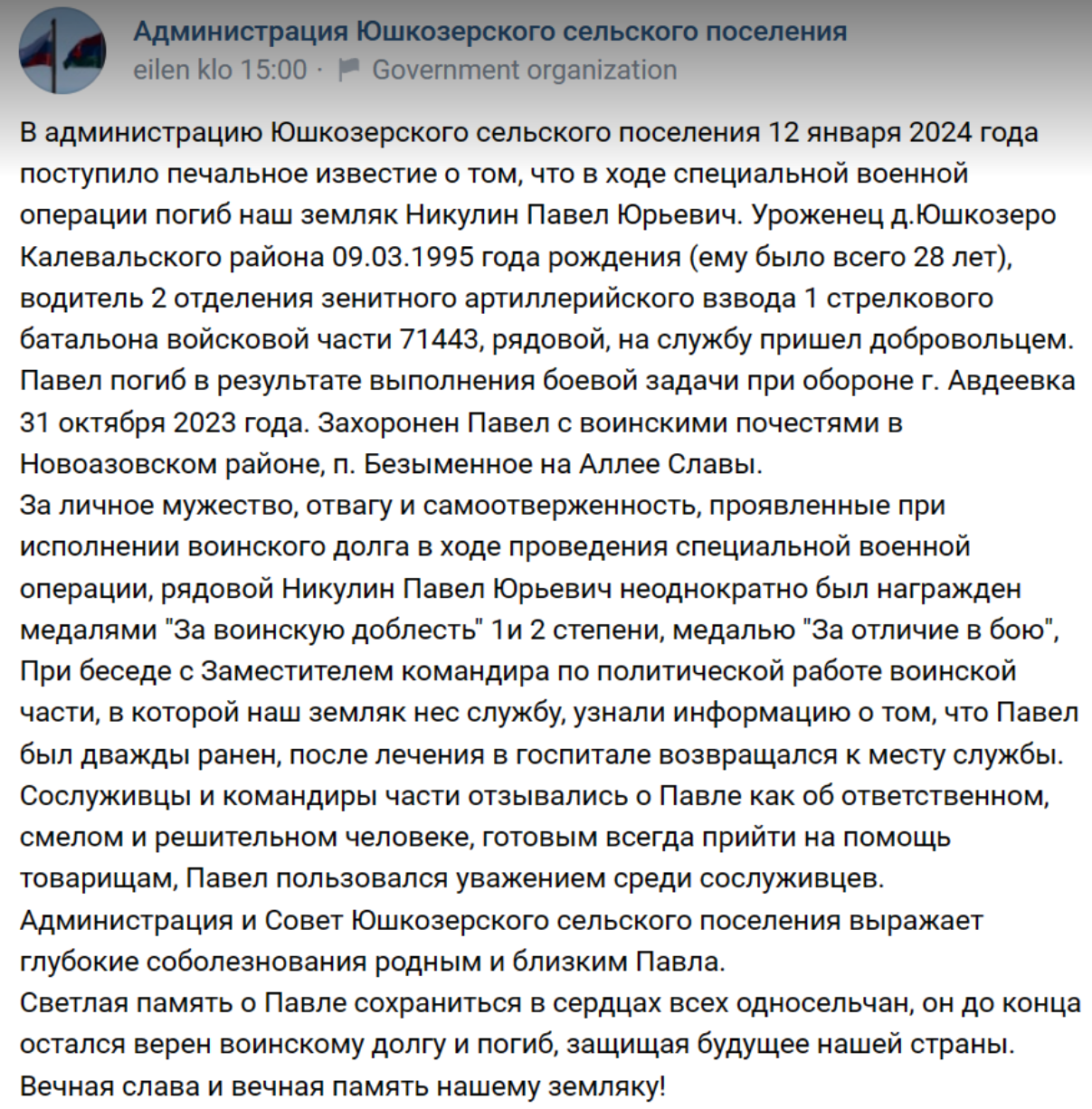 Уроженец этой маленькой деревни Павел Никулин в октябре 2022 года отправился добровольцем на войну с Украиной. По информации районных властей, служил там в артиллерийском расчете. Спустя пару месяцев его мать, работница местной метеостанции Антонина Никулина была трижды оштрафована за дискредитацию армии.