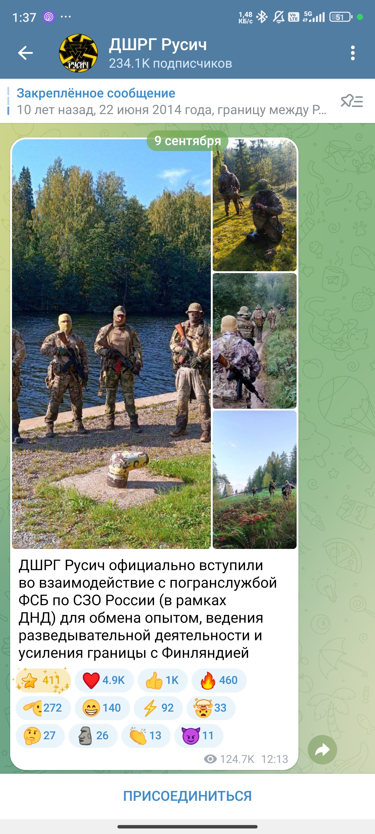 Новость вечера: "Неонацистская группировка «Русич» будет помогать ФСБ охранять финскую границу на добровольных началах. В телеграм-канале отряда говорится, что он займётся «разведывательной деятельностью».
