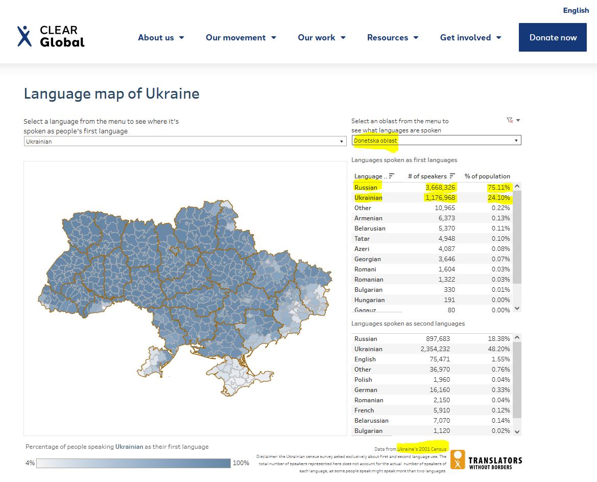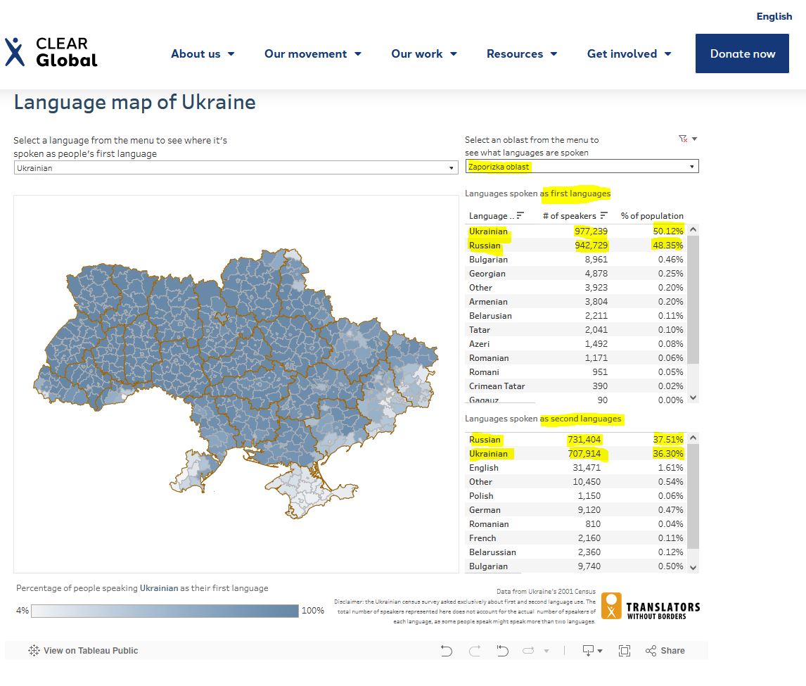 Если в 1897 великорусский родной перекрывал малорусский только в Одесском уезде Херсонской губернии и был почти таким же в Славяносербском уезде Екатеринославской губернии, то по переписи Украины 2001 русский перекрывает украинский вот так: https://clearglobal.org/interactive...ge-map-ukraine/ https://clearglobal.org/language-data-for-ukraine/