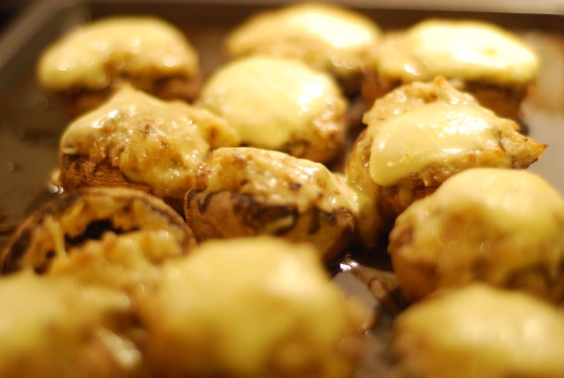 Сегодня сделала жюльен в грибах. Очень просто: жарится мелко-мелко порезаный лук, в то время из шампиньонов вырезаются ножки и также мелко режутся. Добавляются к луку. Обжаривается несколько минут, добавляется соль, сметана и тёртый сыр, этим фаршируются грибы - и в духовку.