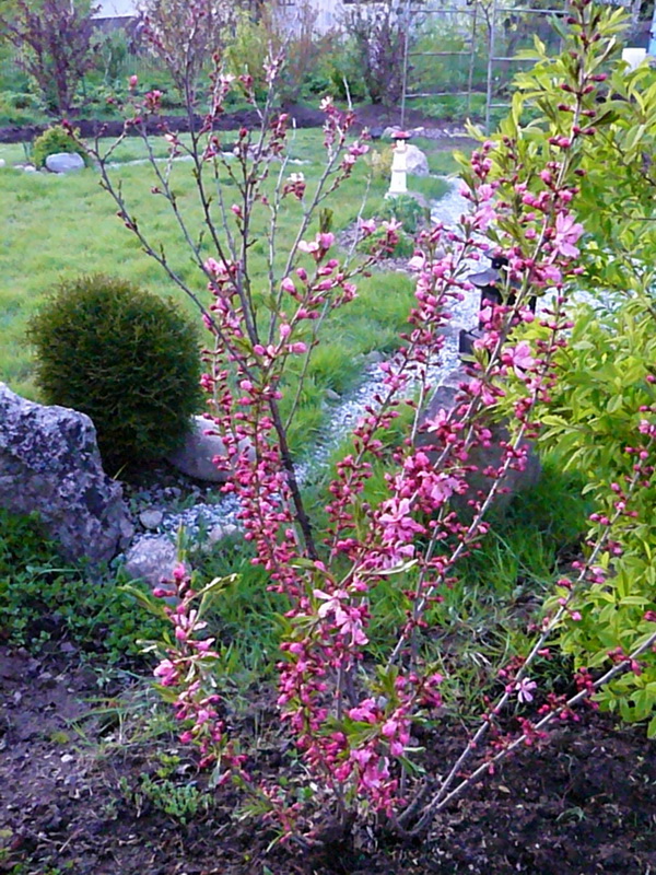 Миндаль и спирея в весеннем саду.