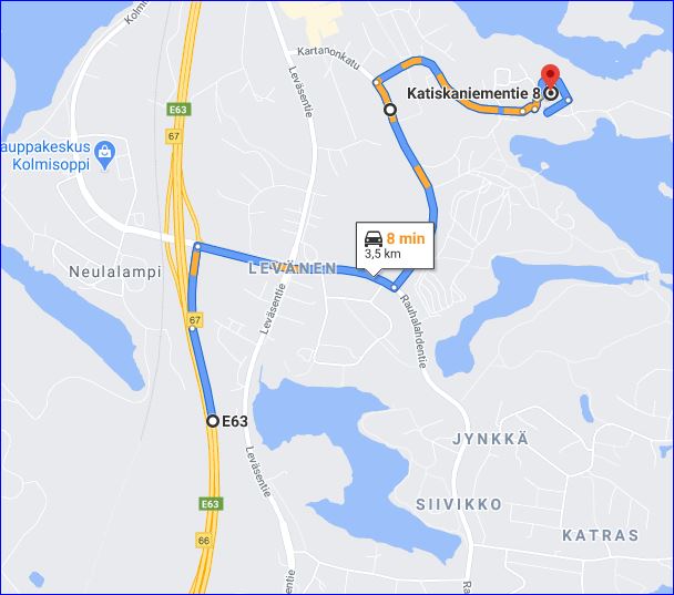 Через Куопио проходит 5 трасса, а не 63. Со съезда с трассы до кемпинга 1,5 км. Дорога асфальтовая, как и в других городах.