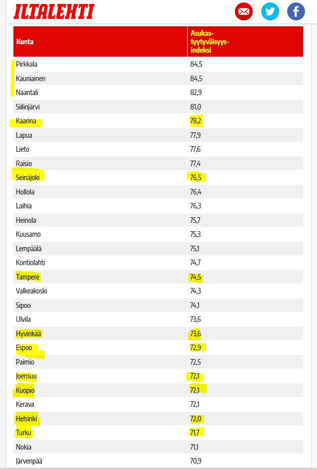 См. топ-10 лучших городов по Kuntien imago- taloustutkimus, это ежегодное исследование с 2017 года среди 36 самых крупных городов/муниципалитетов: Espoo, Helsinki, Hyvinkää, Hämeenlinna, Joensuu, Jyväskylä, Järvenpää, Kaarina, Kajaani, Kangasala, Kerava, Kirkkonummi, Kokkola, Kotka, Kouvola, Kuopio, Lahti, Lappeenranta, Lohja, Mikkeli, Nokia, Nurmijärvi, Oulu, Pori, Porvoo, Rauma, Rovaniemi, Salo, Savonlinna, Seinäjoki, Tampere, Turku, Tuusula, Vaasa, Vantaa, Ylöjärvi. https://www.taloustutkimus.fi/tuott...o-tutkimus.html
