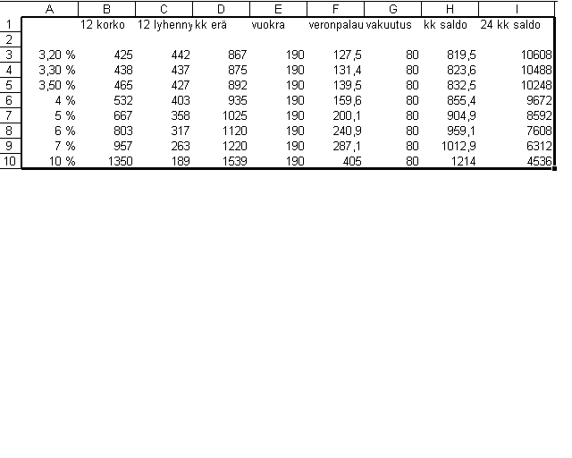 я вот сделал для удобства планирования табличку с формулами. Начальная информация берется, например, с сайта http://www.hypo.fi/lainalaskuri_kuu...a.asp?4;15;; 1 Заключается она в размерах процента и укорочения на определенный месяц. Например, если хотим просчитать средние данные за два года -- 24 месяца -- берем месяц 12, т.к. он является серединкой, а цифры средним арифметическим за два года.
