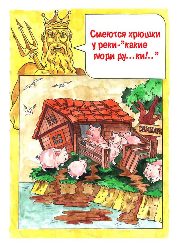 .....Kitoksija paljon! Традиционная графика- перо (стальное), черная тушь и бумага, если цвет, то акварель или заливка в графических программах, люблю Fotoshop. Здесь работа из серии природоохранных листовок, не совсем юмор, типа, что нельзя строить вблизи реки...