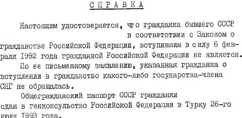 ну если я умею правильно читать, то в справке написано, что дама не является гражданской РФ (в соответствии с каким-то там законом) и что она же написала заявление, что не получила гражданство другой страны СНГ (типа Украины или Казахстана). Она "просто" сдала паспорт СССР (под эту самую расписку).