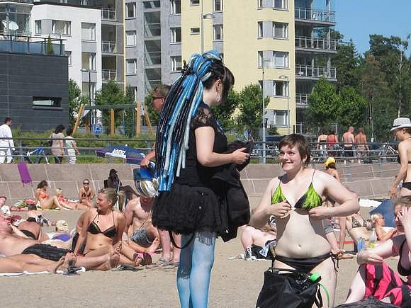 Ну и чего? Одна из них гот, у них своя мода. Все остальные обычные, и у нас присутствуют, на заднем плане даже красоточка в черном купальнике.