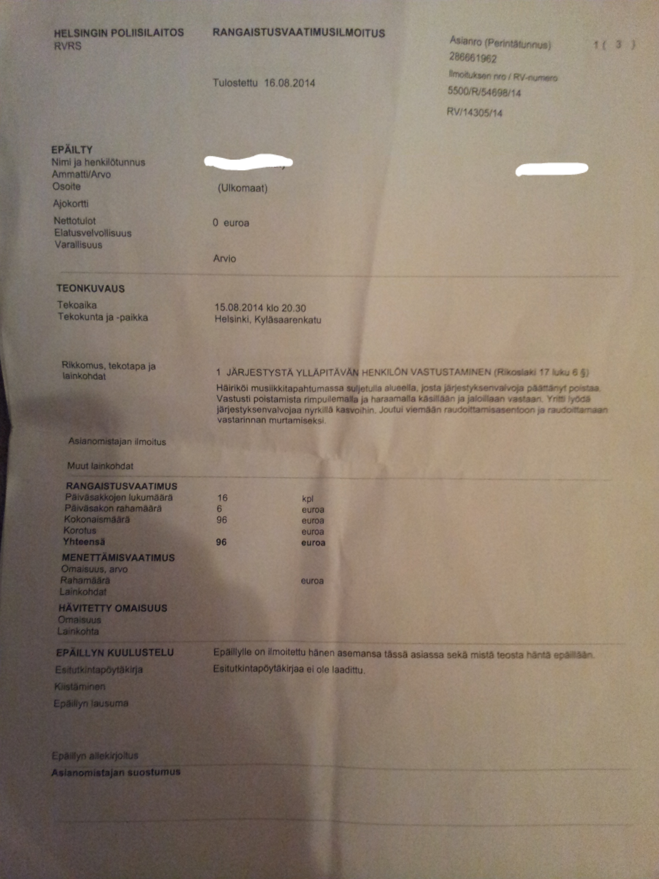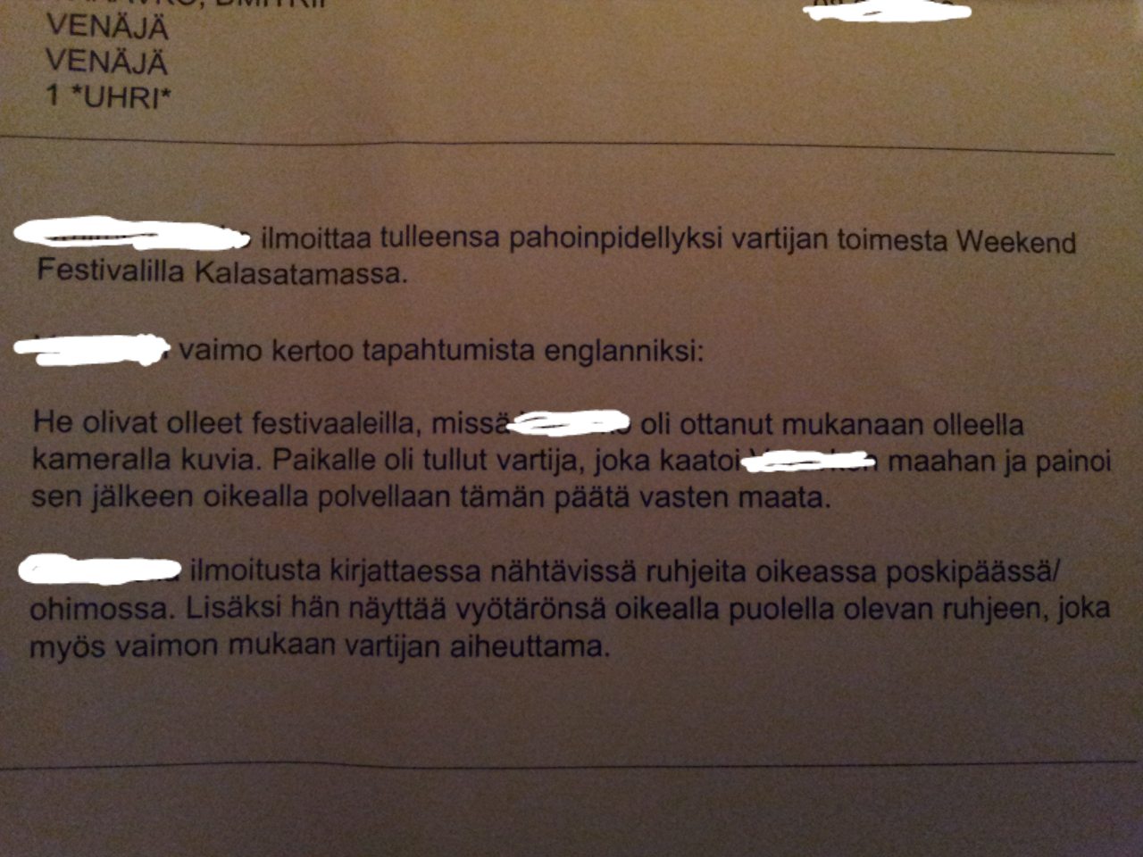 Здравствуйте. Ездил в Хельсинки на эти выходные 15 и 16.08 с женой и подругой на weekend festival, на два дня. В 6 вечера в пятницу пришли на фестиваль. Естественно я был бухой, но я отвечаю за себя в этом состоянии, я никого не трогал. В 8 вечера я стоял с торца сцены и снимал на мобильник диджея, меня за сцену за шиворот оттащил секьюрити и начал орать на меня «What are you doing?» . Я промямлил что просто снимал видео. После этого он повалил меня на землю, прижал голову коленом к земле и надел на меня наручники. Он был очень агрессивен, постоянно факался и что то орал. Так как мне уже стало тяжело дышать под его тушей я начал хрипеть help, policia. На что тот сказал окей, и отвёл меня к полицейским. На этот момент я уже был с окровавленной об гравий рожей в порванной одежде. Те сняли с меня наручники. Этот урод им что то сказал, сорвал с меня браслет-билет на два дня. Я понял что праздник по какой то причине для меня уже точно закончился и попытался двинуть ему по роже. Полицаи сразу вернули мне наручники и заперли в пикап. Перерыли мою сумку, спросили где я остановился и отвезли в участок, где забрали все вещи и обувь и заперли на 12 часов. На следующий день я обратился в полицию, там составили что то типа рапорта, не знаю что это и к чему может привести, но хотелось бы как нибудь добраться до гада – законными методами. Посоветуйте что можно сделать.