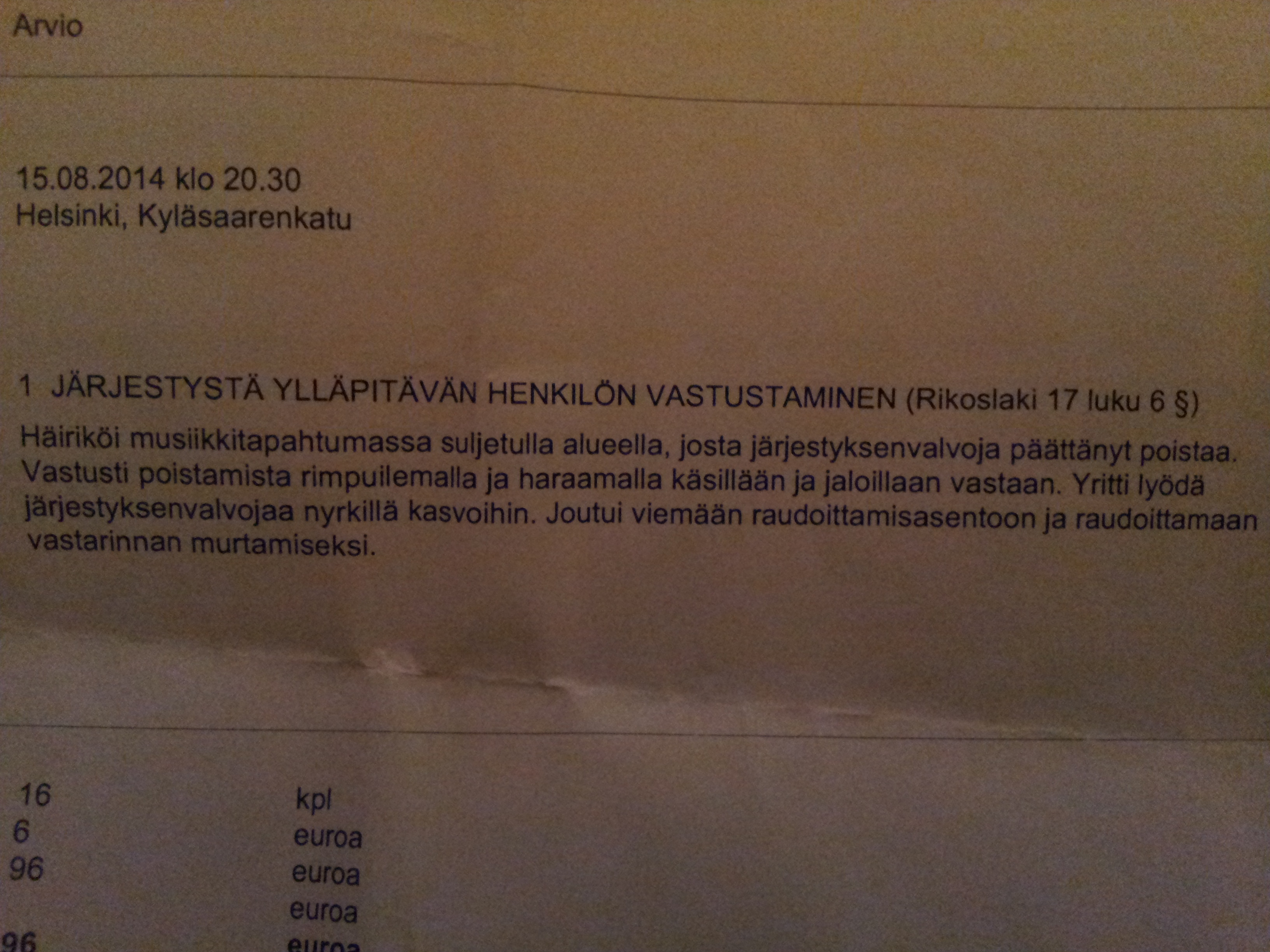 Народ, не нужно мне сочувствовать и ругать то же не надо. Если на концерте продают алкоголь, значит там можно быть бухим. Если в Амстердаме продают наркоту, значит там можно быть обдолбанным. Если в германии легализованы шлюхи то тд и тп. А если вас не интересует такая часть отдыха. Допустим я нарушил некую зону, в которой я не должен был находиться. Окей, хотя это ещё то же под вопросом. Далее два вопроса: правомерно ли было меня выводить за территорию концерта и почему меня пришлось бить профессиональному охраннику под 100 кг весом, даже если бы я упирался. Если кто осведомлён как должна действовать охрана в Финляндии в таких ситуациях, отпишитесь пожалуйста. Если кому не сложно прочитать Laki järjestyksenvalvojista 22.4.1999/533 из поста Chiko1 (спасибо), и найдёте что ниб интересное, напишите пожалуйста.