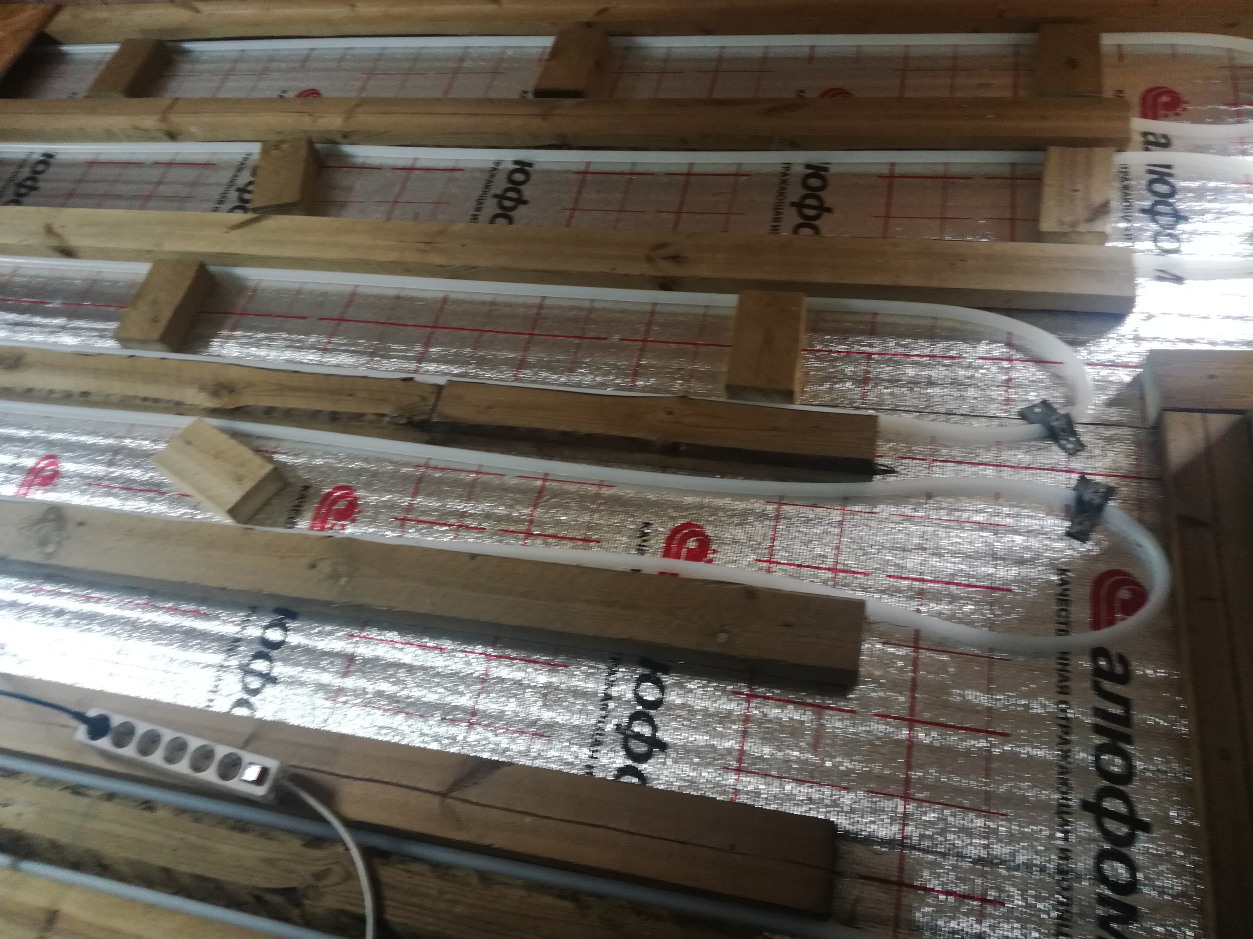 Мы купили материалы в финском магазине. Эти трубы хорошего качества которые установлены под полом всё куплено с гарантией. Мы их по полу с фольгой разложили как положено и вывели куда положено прямо к центральным трубам.