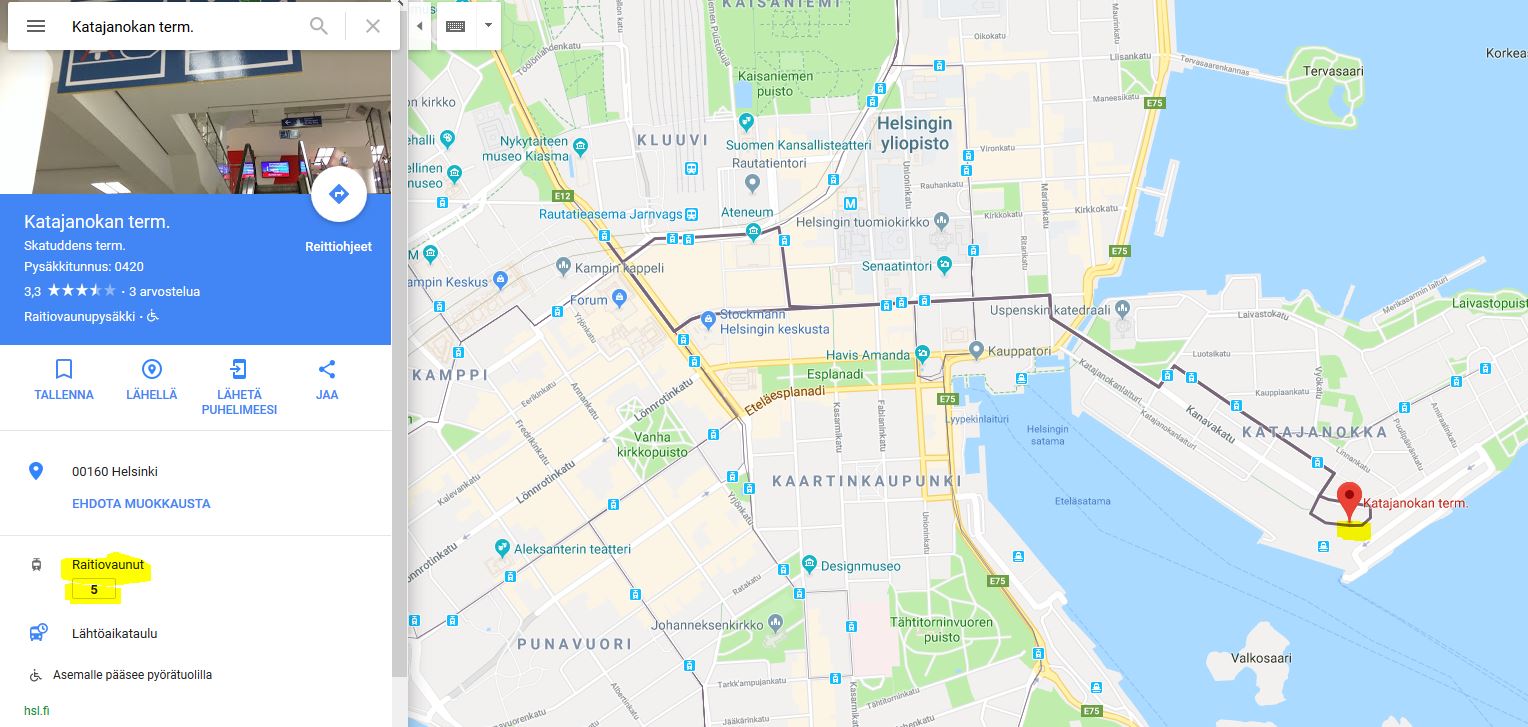 Так надо ей воспользоваться, ссылкой! https://www.reittiopas.fi/reitti/Ra...5&walkSpeed=1.2
