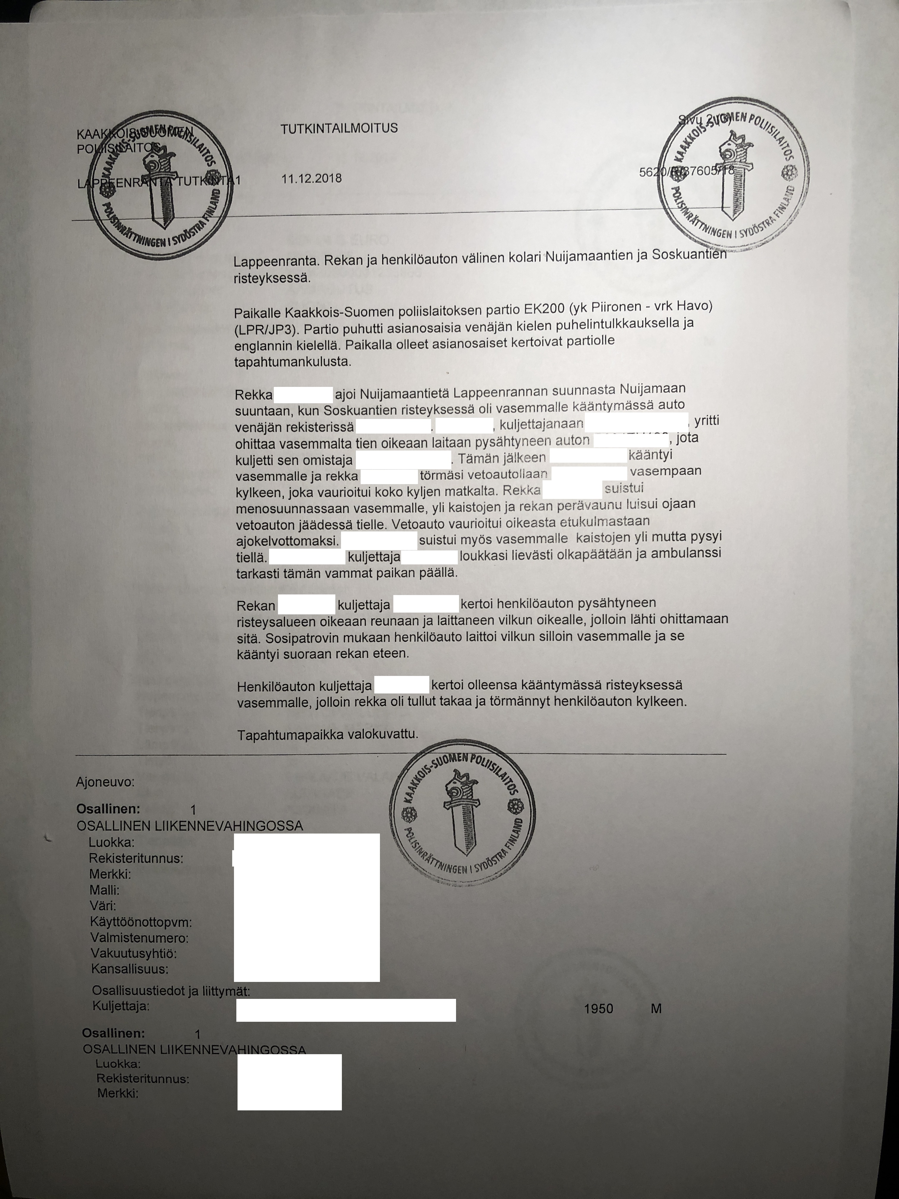 ДТП было в выходной день, соответственно, отделение полиции не работало и официальный рапорт о происшествии я забрал через несколько дней, приехав в будний день. Рапорт я сразу передал в страховую компанию A-VAKUUTUS, там же заполнил схему ДТП, оставил свои контактные данные и банковские реквизиты.