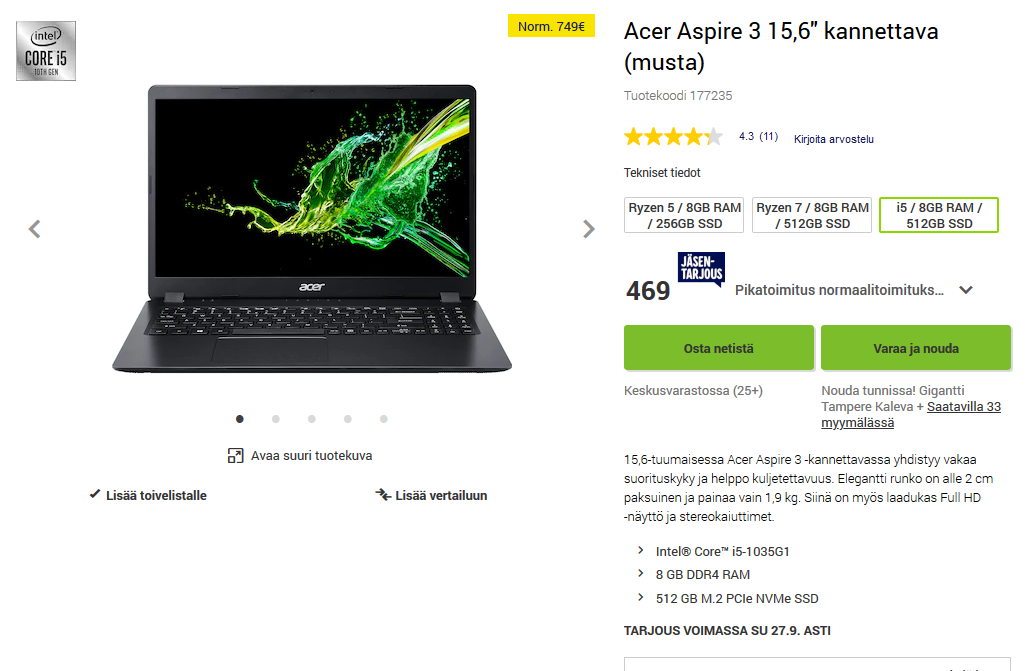 Вот в Gigantti неплохой ноутбук при условии, что в эту модель можно потом (когда захочется) самостоятельно добавить второй винт и еще одну планку памяти.