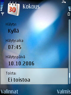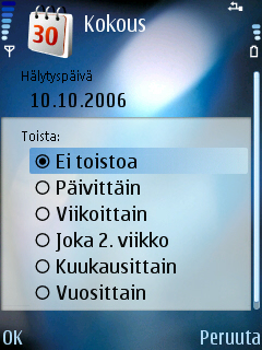 Попробуйте Kalenteri>Valinnat>Uusi merkintä>запишите,что надо>Hälitys>Kyllä>Hälitysaika ja Halityspäivä>Valmis.
