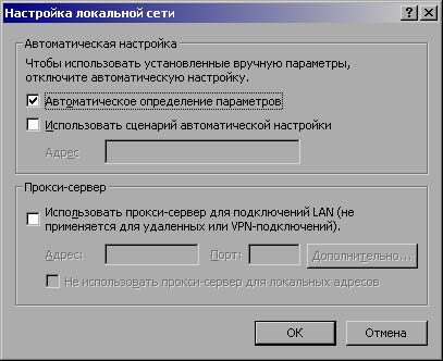 Потом надо проверить настройки Explorera: "Сервис" -> "Свойства обозревателя..." -> "Подключения". Бывает так, что когда компьютер покупается с установленным внутренным модемом в этом меню прописывается подключение именно через модем. Подключение через модем надо удалить. Потом нажми в том же окне на кнопку "Настройка LAN..." и проверь, чтобы окно выглядело так как на рисунке. Далее нажми "ОК" и вернись обратно. Затем нажми на кнопку "Установить..." и там в мастере сделай настройку интернета вручную через локальную сеть. Далее действуй по инструкции мастера. Одна оговорка - сеть надо настраивать без доменов.