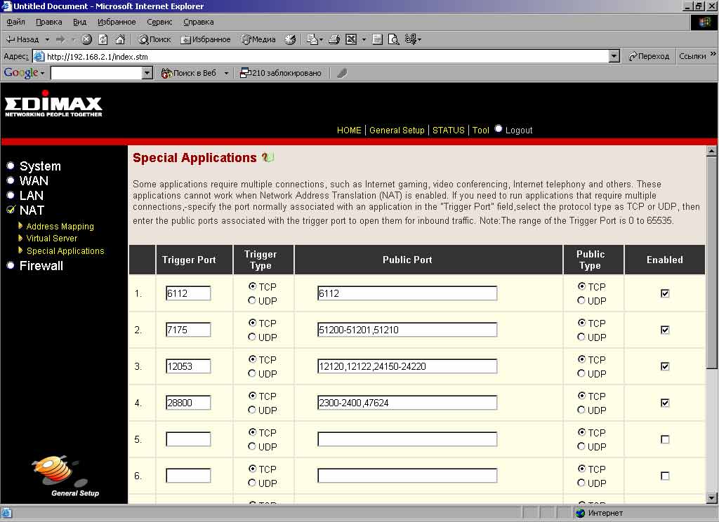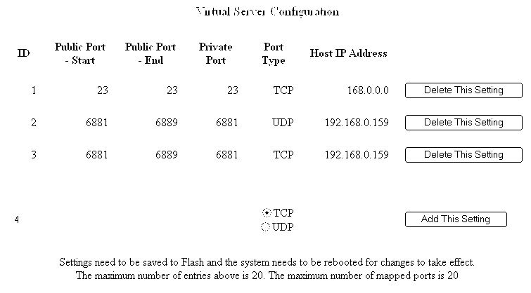 А ты маленько не то настроил. Если бы ты внимательно смотрел на мой скриншот, то обратил бы внимание какую страницу надо настраивать. Не "Virtual Server", а "Spesial Applications". Так ты настроил у себя Web и Ftp сервер, но для этого нужно по этому адресу иметь реальный сервер, например Windows 2000 Server или 2003 Server, со всеми вытекающими из этого последствиями.