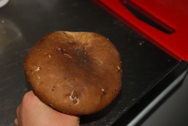 Видела такие грибы. Шляпка у него бархатистая и вырастают они до см.30 в диаметре. Вроде его ещё лосиным называют.