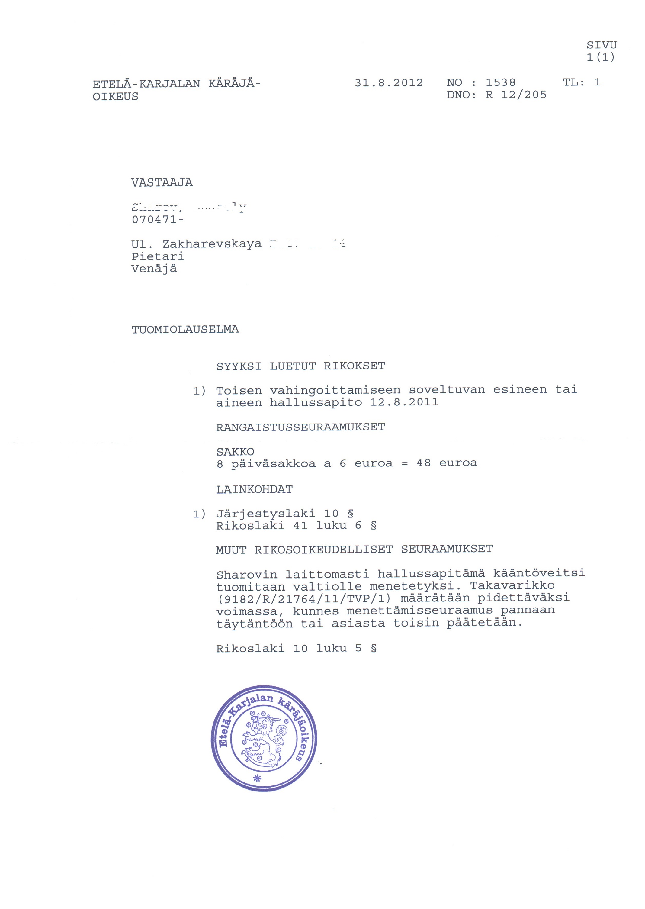[IMG]Вот решение суда, я перевел его как штраф в 48 евро и все.