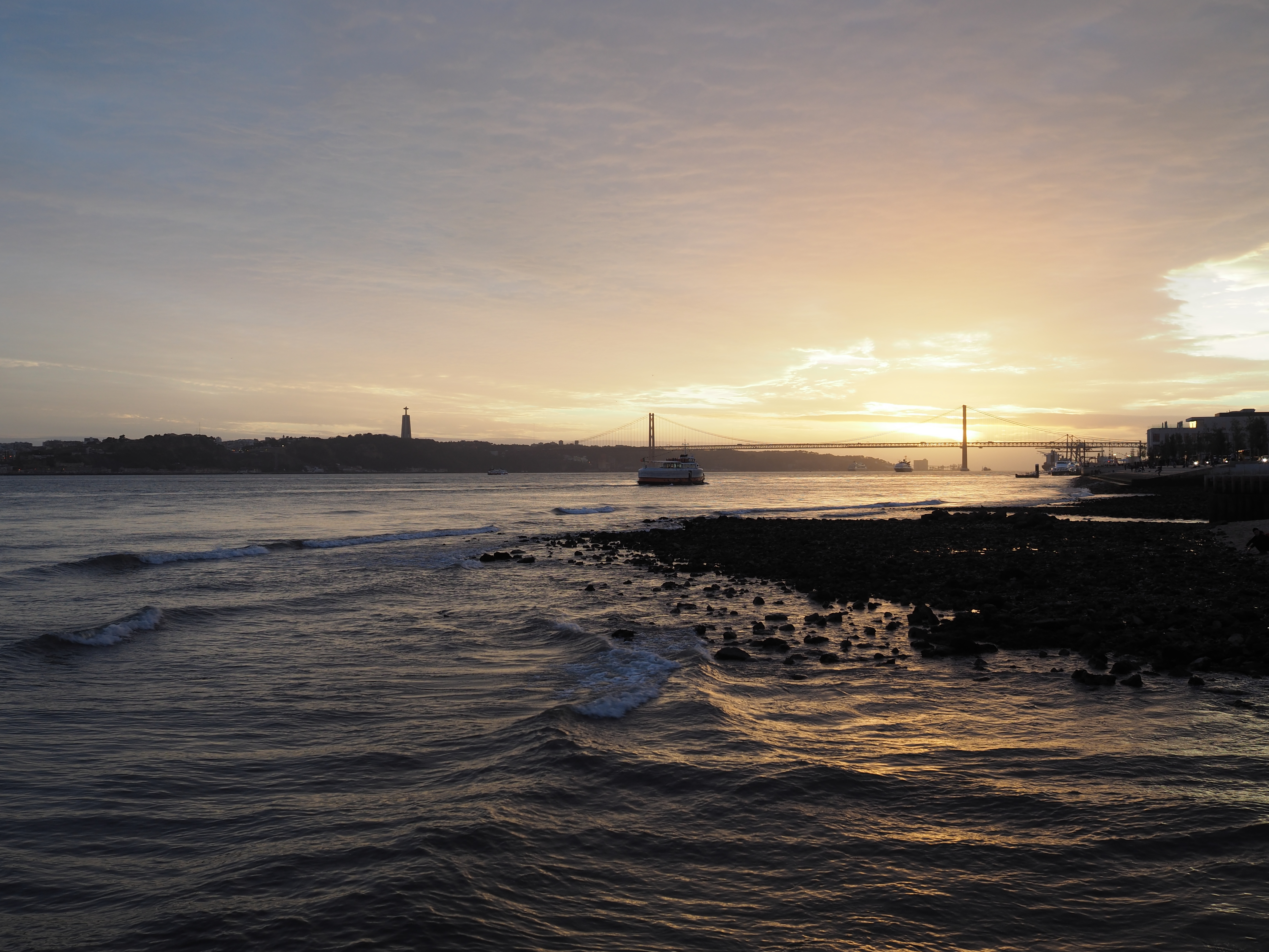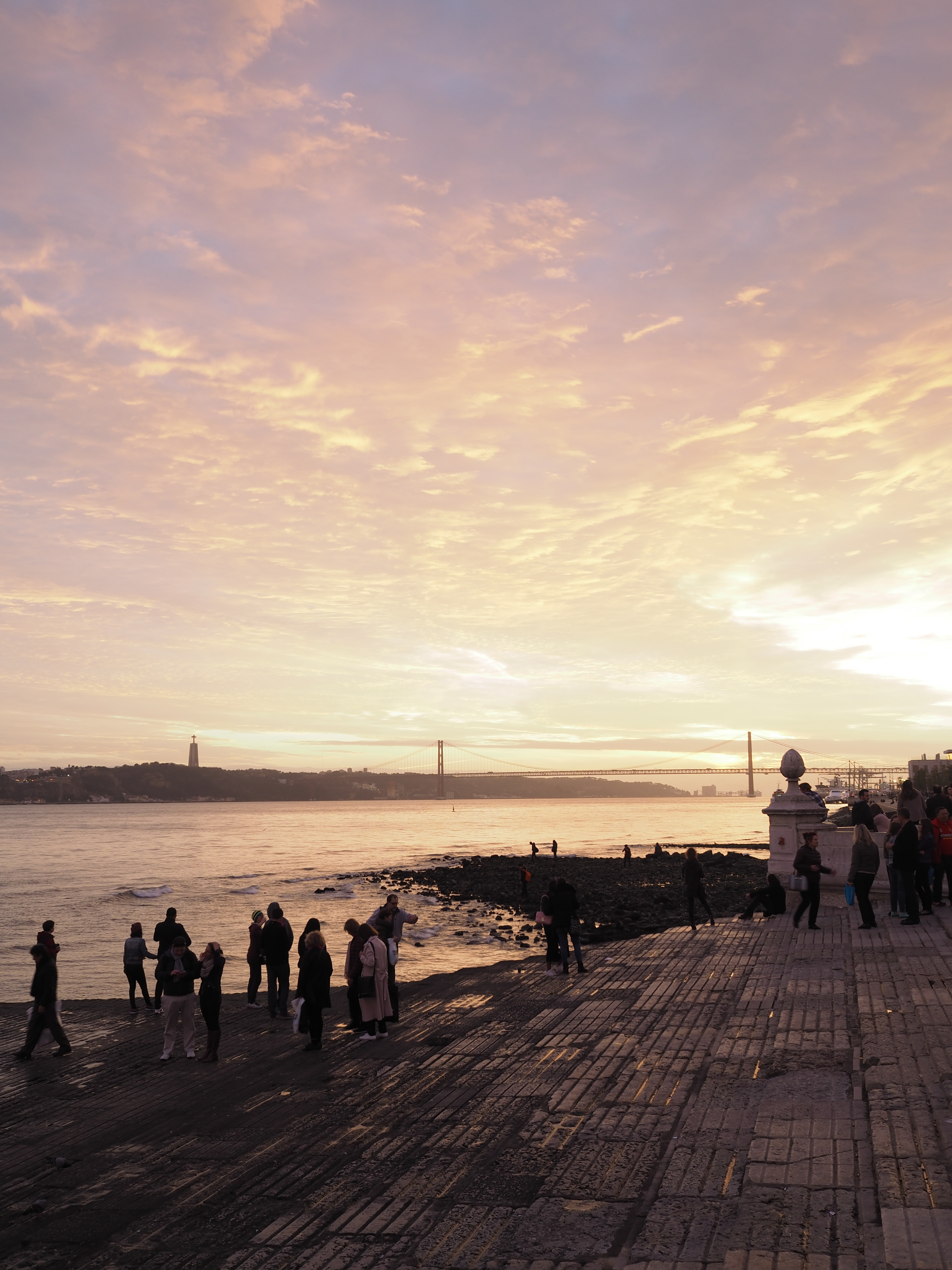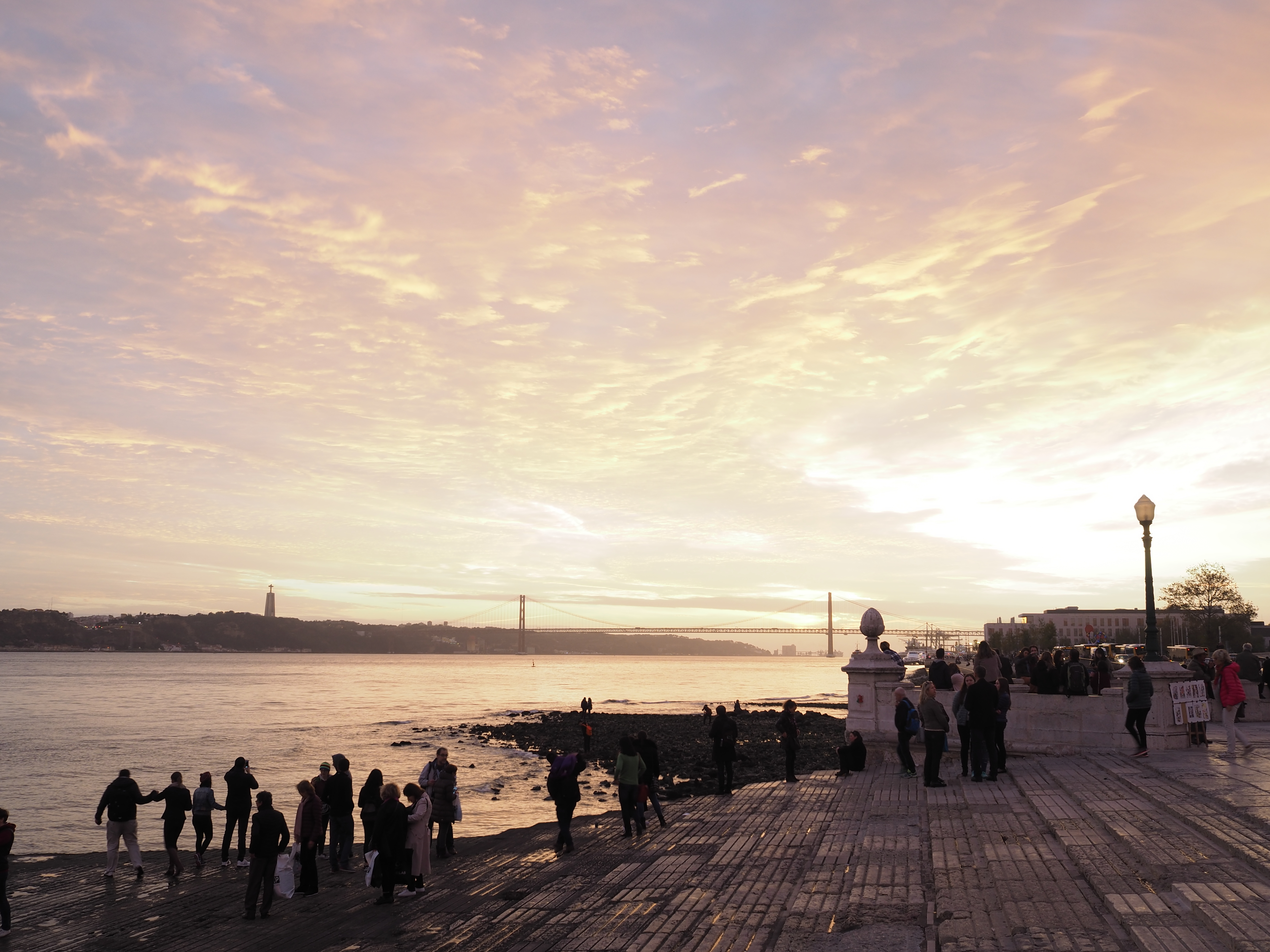 Вид набережной из центра Лиссабона - на том берегу статуя Христа, висячий мост Ponte 25 de Abril/мост имени 25 апреля, золотой закат...эх, красота!