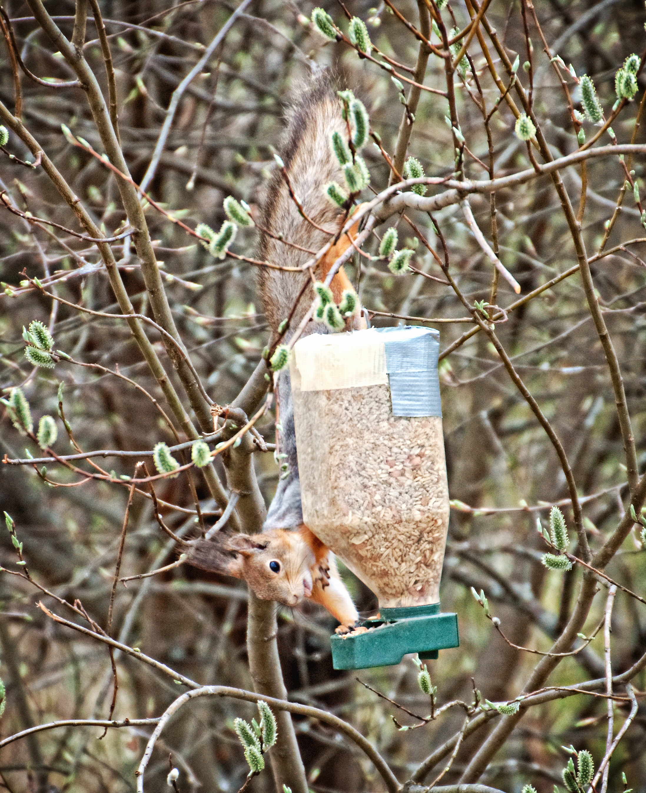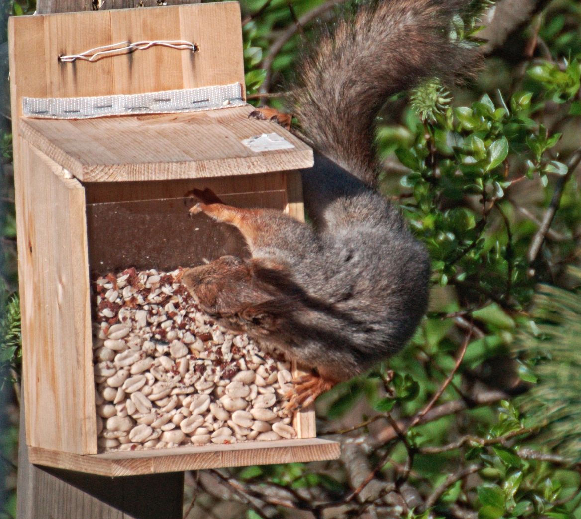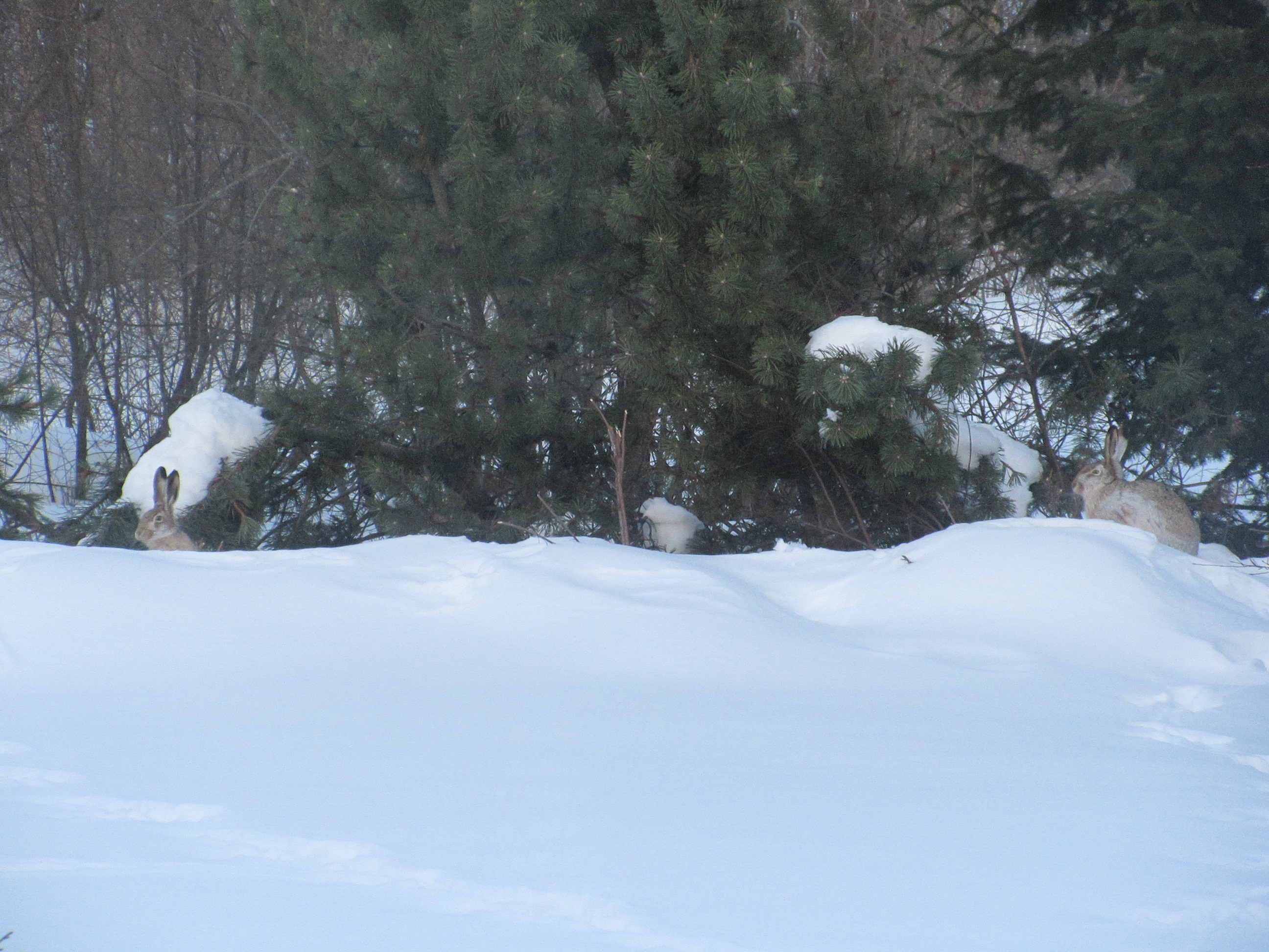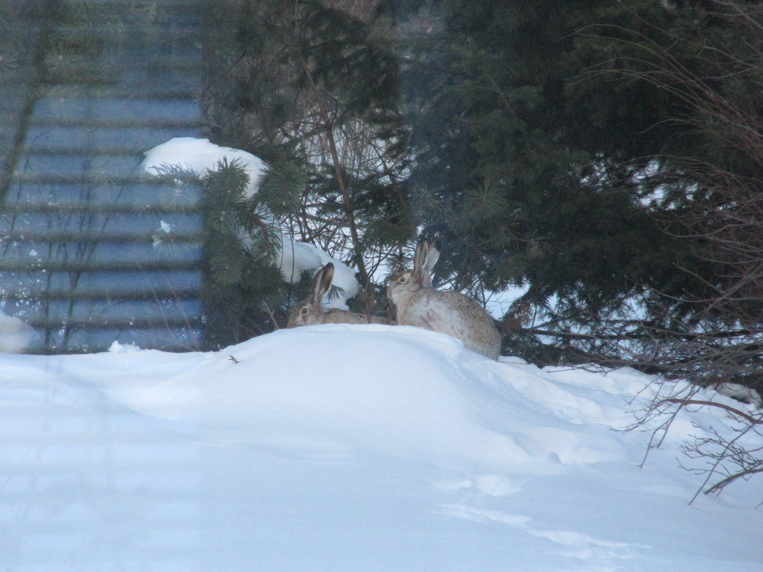 Раньше кормушку для птиц держали перед кухонным окном,так при большом количестве снега заяц стал дотягиваться до кормушки,научился её раскачивать и и сыпать еду на снег.Что-то поедал,что-то оставлял.Потом я это дело прекратил,теперь у нас на содержании только белка,что опять же мне не сильно нравится