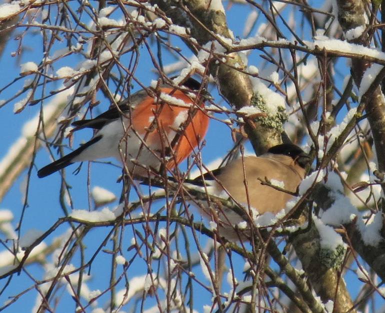 Снегири вполне могут добывать себе пропитание сами, и,возможно,поэтому их не видно на птичьих кормушках. Кроме того, они предпочитают иные корма, нежели чем традиционные покупные корма для птиц. Мне тоже было удивительно, что за долгие годы жизни в Финляндии не удавалось увидеть снегирей! По весне и летом, порою, на зябликов можно подумать, что снегири - хотя не такие у зябликов красные грудки, и клюв другой, и повадки... Но этой зимой снегири были! ...Чищу снег во дворе,иногда поднимаю голову, чтобы отдышаться - и вдруг на освещённой солнцем макушке берёзы что-то маленькое красноватенькое... и это был снегирь! И если специально присматриваться, то потом уже их много можно увидеть было. Самочки снегирей, кстати, не с красными грудками, а с серенькими.