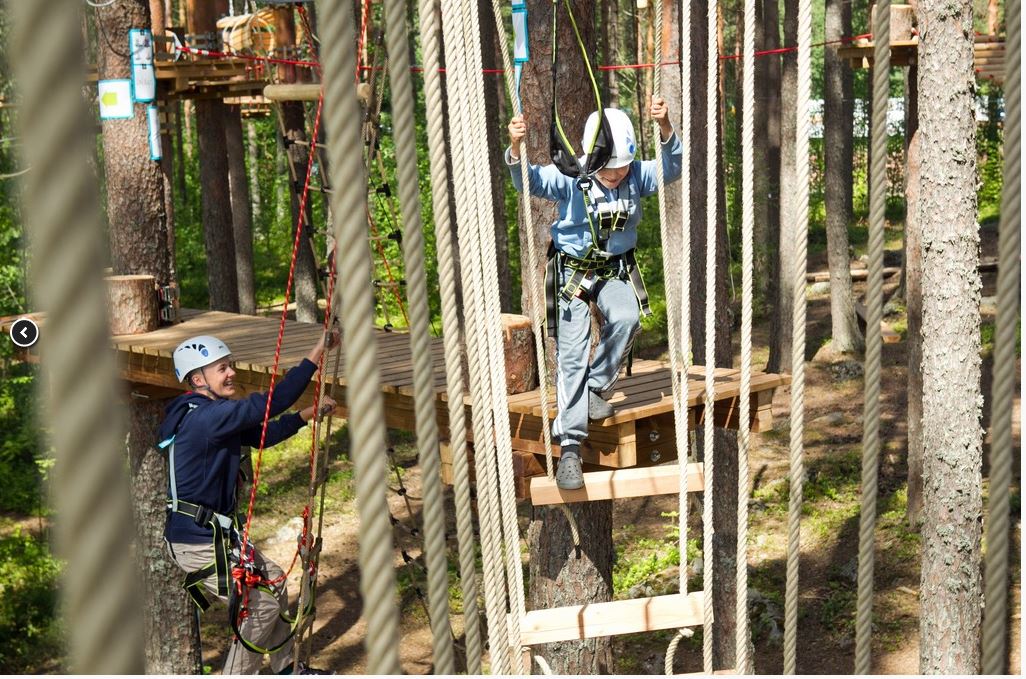 Иногда зимой дите само гоняет на снегоходе. Еще у нас около дома есть скалы, мы там поднимаемся наверх и прыгаем. Пару раз лазали вместе по веревочным тропинкам в Ювяскюля и в Яхтяри. В теплую погоду всем понравилось, но в дождик замерзли и промокли совсем.