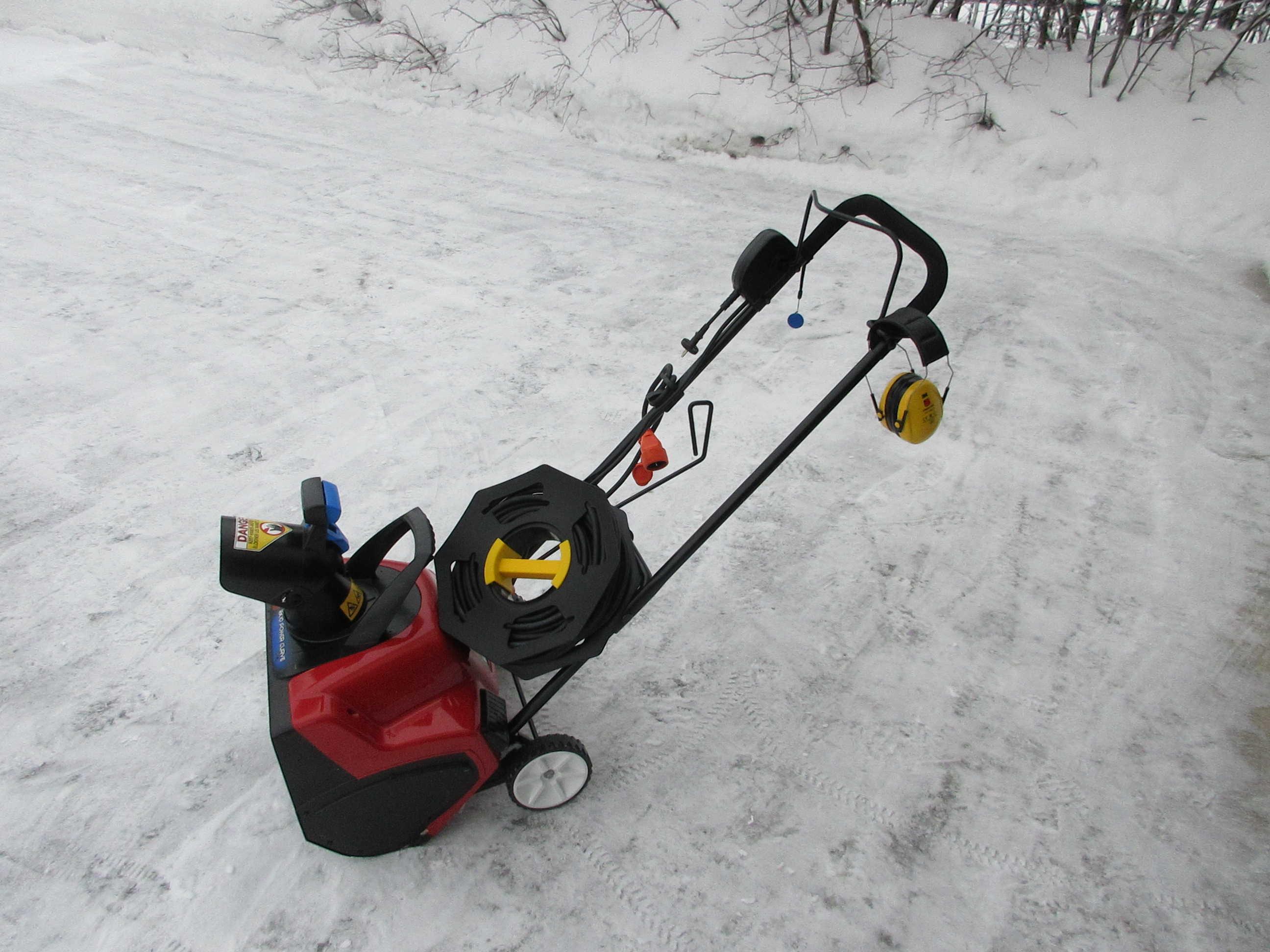 Хотя сперва он тоже с подозрением отнёсся к моей идее электроснегоуборщика, зато теперь очень полюбил этого электрического Торо. Этот малыш на вид игрушка, а, оказался очень прытким - бьёт мощной струёй по дуге метров на девять в длину и на четыре вверх. И он весьма лёгкий, его легко таскать туда-сюда. Купили для него три удлинителя 20+20+10, 50м хватает для уборки нужного периметра. Шнур за ним ползает, но к этому, оказалось, легко приспособится.