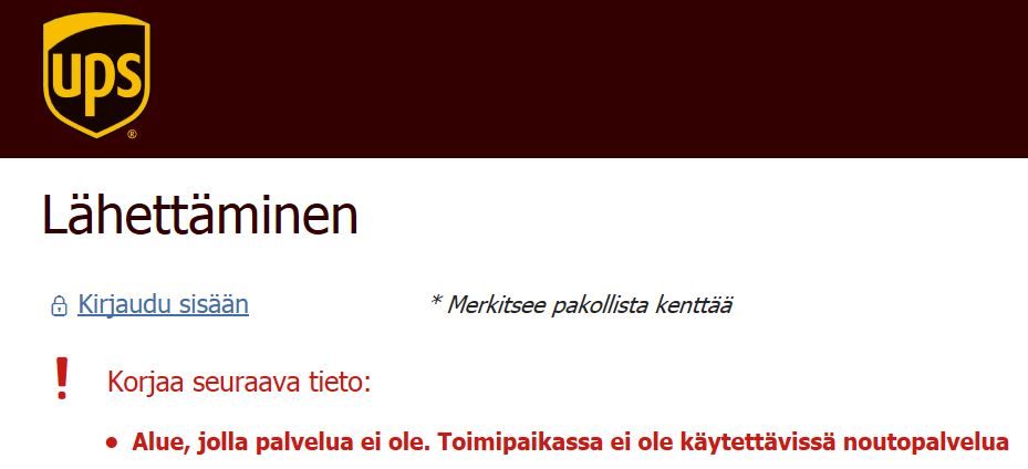 Я проверил ещё раз (попытался заказать доставку на сайте УПС) - ответ: "Alue, jolla palvelua ei ole. Toimipaikassa ei ole käytettävissä noutopalvelua."