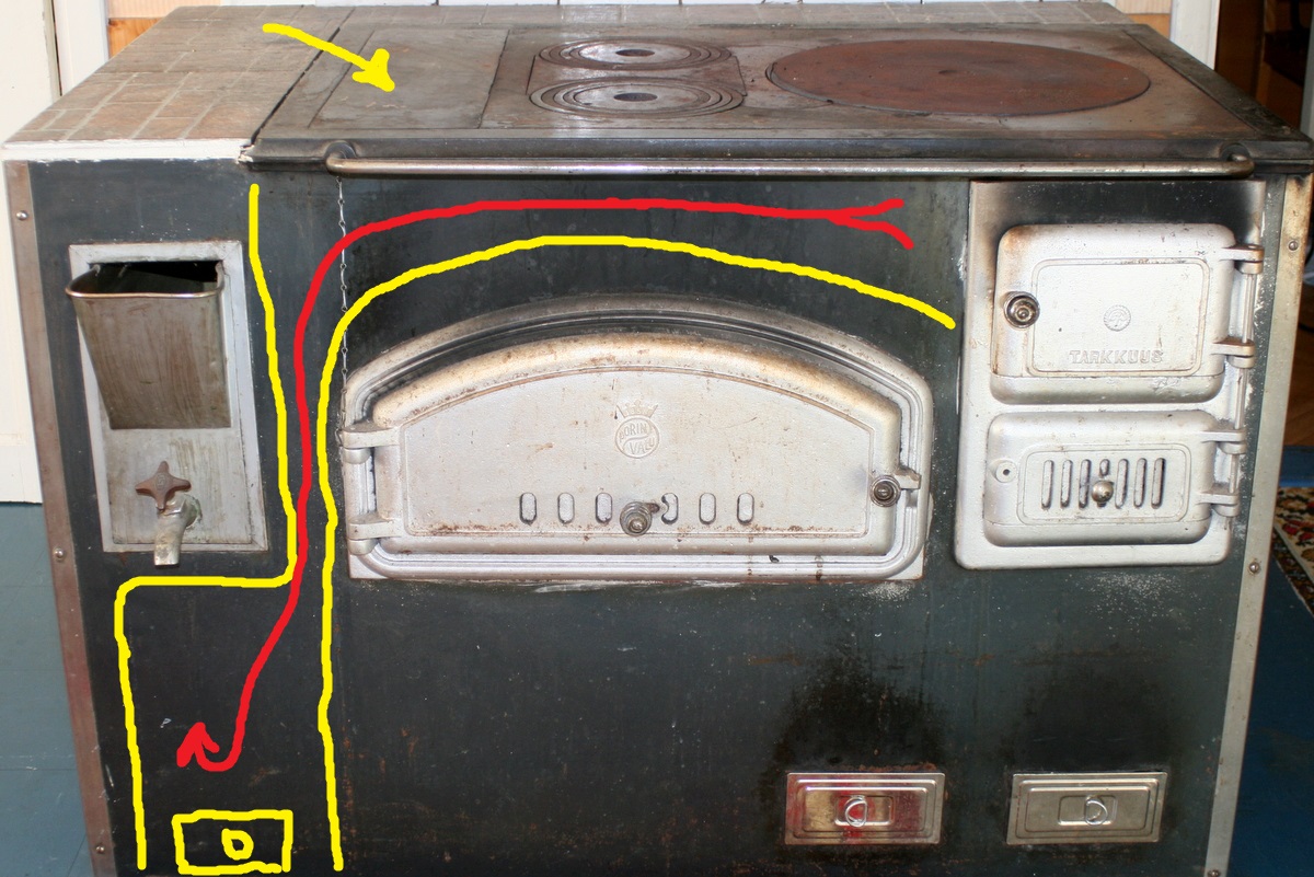 6. В моём случае (левая заслонка для плиты) бак с водой грелся от плиты. В Вашем случае надо бы попробовать методом тыка - может от духовки, но мало вероятно. Скорее тоже от плиты. Только я тогда плохо себе представляю схему дымоходов.