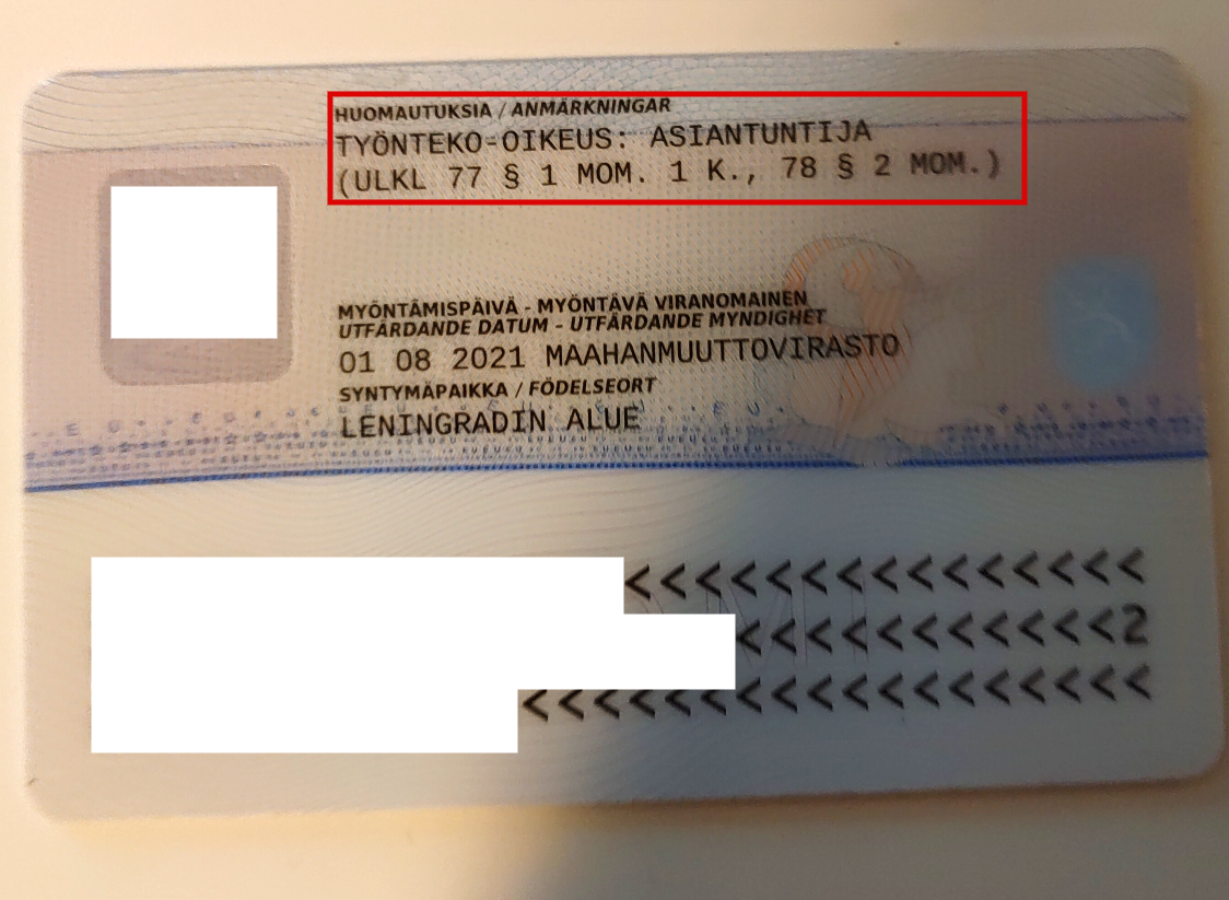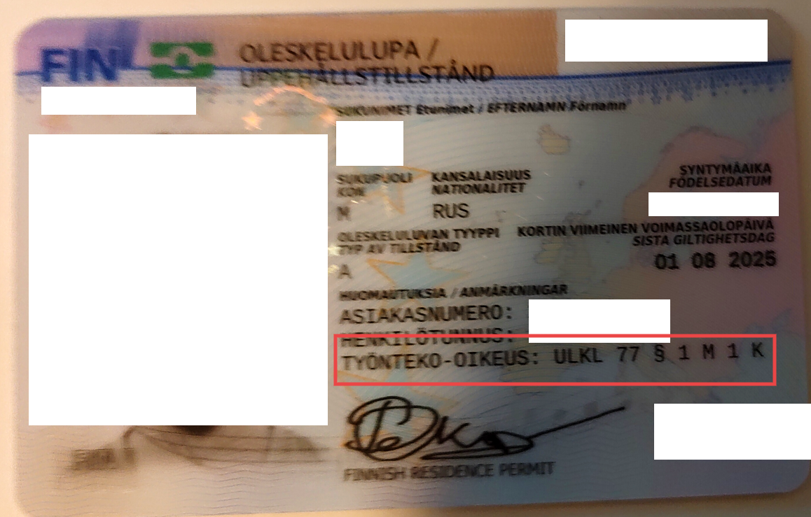 Вы посмотрите, что у вас написано на самой карточке. Там на стороне, где фото, есть строчка TYÖNTEKO-OIKEUS, т.е. право на трудоустройство. Часто напротив этого пункта стоит номер статьи и пункт закона из Ulkomaalaislaki (по-английски Aliens Act, по-русски что-то типа "Миграционного Кодекса"). Соответственно, оттуда можно и оттолкнуться. Что у вас там написано?