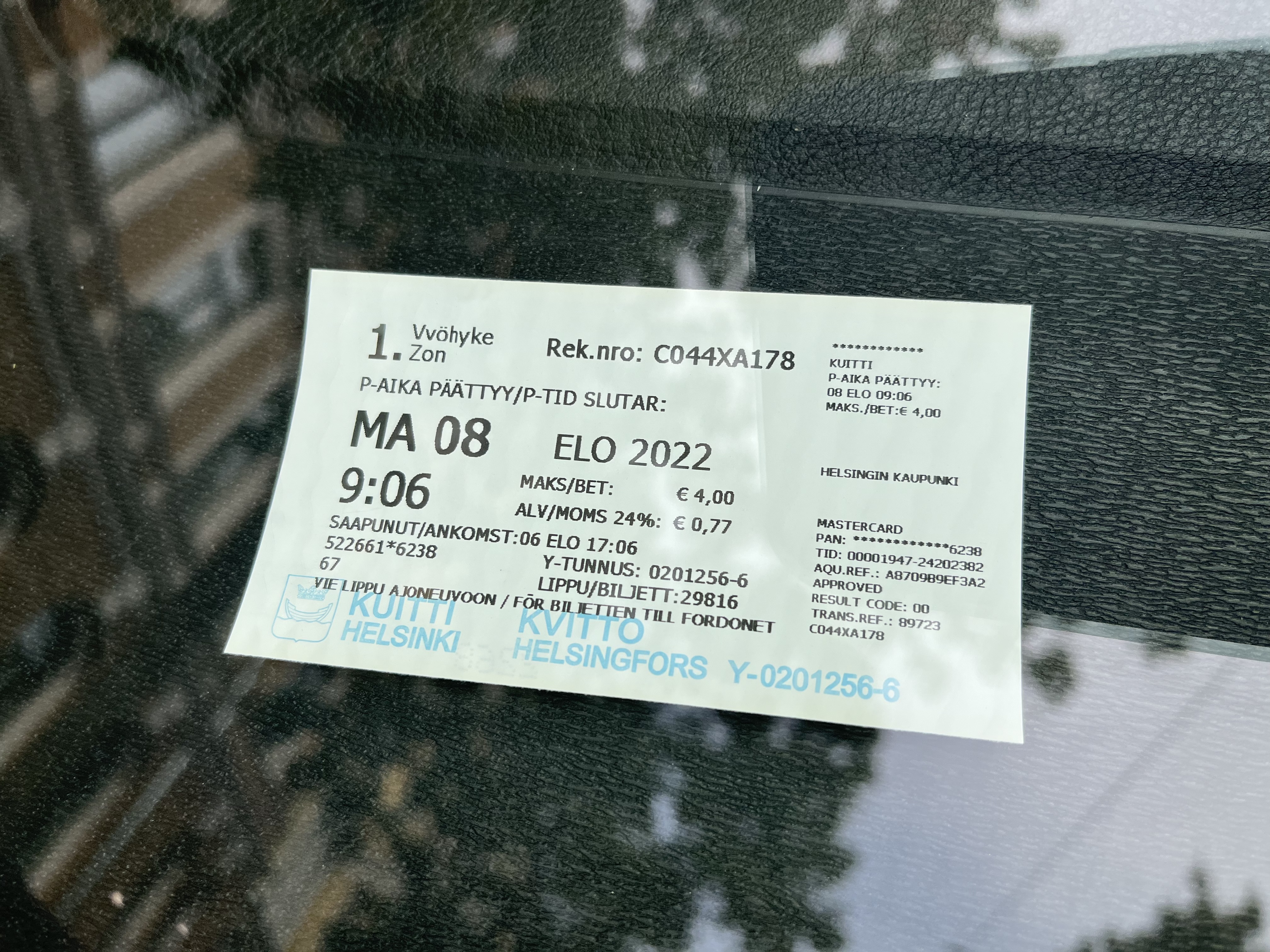 Парковка в этой зоне (центр Хельсинки зона 1) платная и ограниченная.