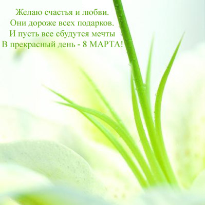 Дорогие Дамы! Позвольте поздравить ВАС от всей души с чудесным весенним праздником 8-е марта! И пожелать Вам большого личного счастья!!!