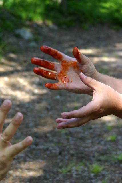все кладется в большую посудину. И мужчина (обязательно мужчина!!!) начинает эту мясо, лук, помидоры мять чисто-вымытыми руками. мнет от души, почти со всей мужской дури.
