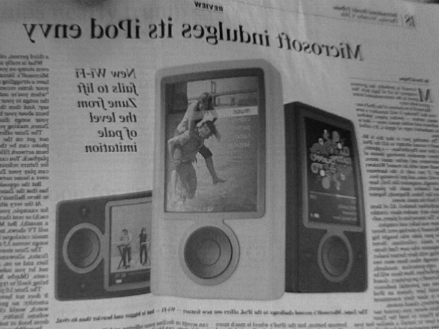 Нашел только что газету в библиотеке, International Herald Tribune за 9ое число... Там как раз говорится о неудачной попытке Майкрософт сделать свою версию ипода. Наворотов много, а толку мало... поищи инфу в нете, это тебя окончательно склонит в сторону Яблока