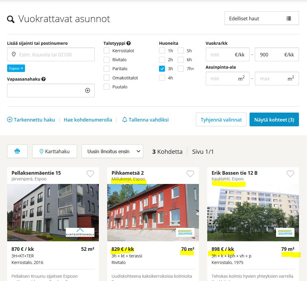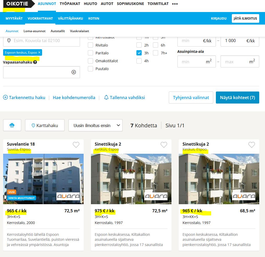 Если изучать цены по агенствам с сайта Эспоо, а не по слухам от форумчан, то трёшка обойдётся минимум в 960е в центре Эспоо, а в дебрях на окраинах минимум в 830е -
