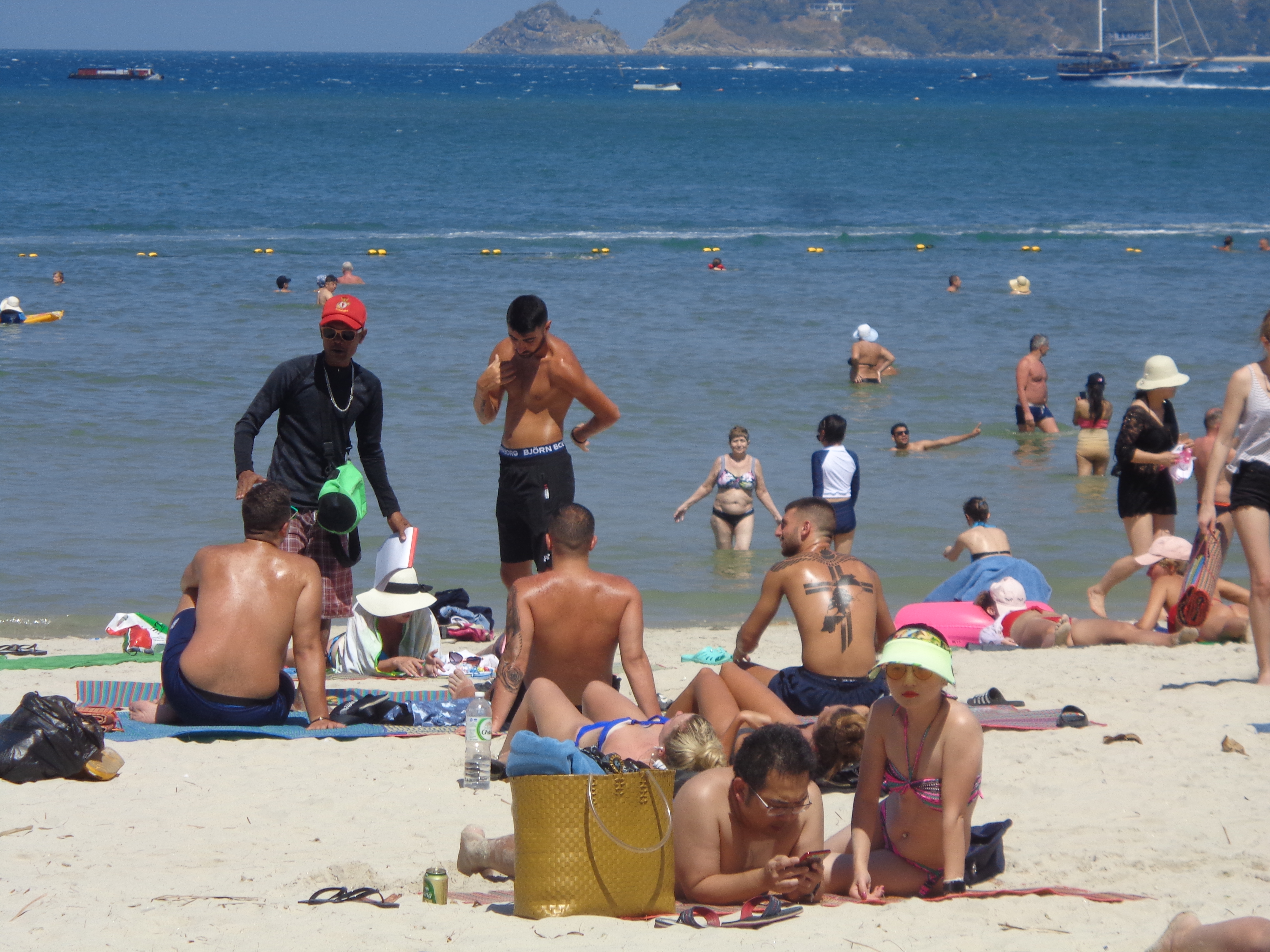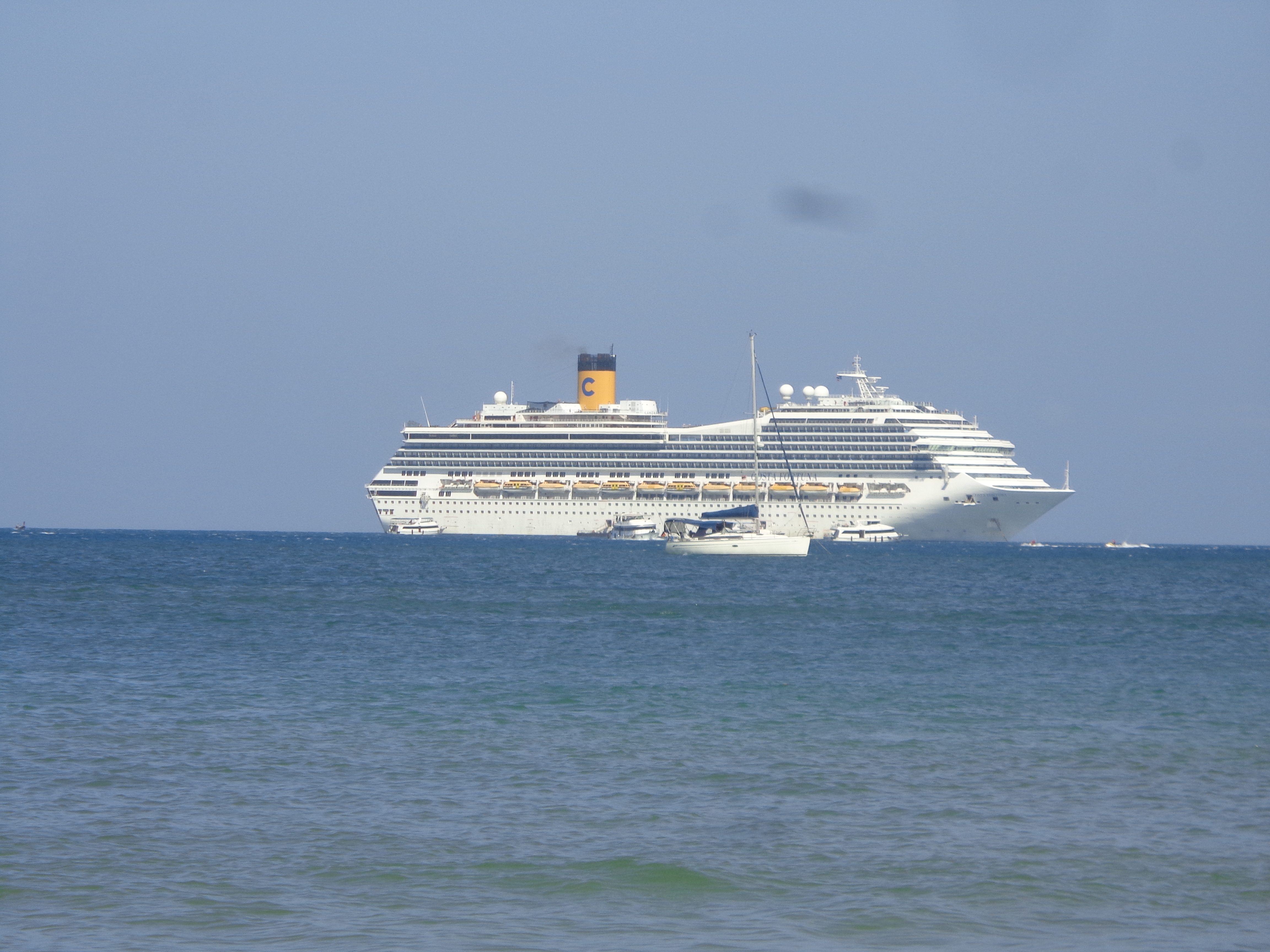 На рейде очередной круизник с богатыми китайцами,а на пляже с утра по-раньше трудятся сокровище-искатели )