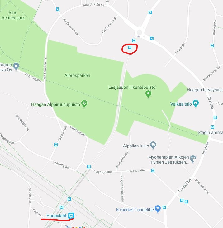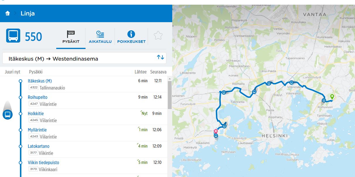 Приехали гости, хочу на общественном транспорте доехать до парка рододендронов в Хааге. Чет HSL показывает только электричку до Huopolahti и там ещё полкилометра шагать.Помню, что добиралась туда на 550 автобусе, остановка рядом, но помню её оооочень примерно. Подскажите, плз, название и вообще, существует ли этот рейс по-прежнему.