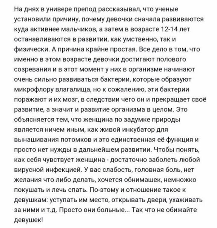 я вот узнала что у женщин есть такой чип который включается, когда она рожает, она сразу все все знает, что делать с ребенком, вот до рождения не знала, а как родила то все сразу узнала, а вот у папы такого чипа нет, поэтому он к ребенку не подходит и близко, а вдруг тот кусается или плюется, а вдруг он обкакается, а у папы нет чипа "ухода за детьми", поэтому он не знает, что делать с этим всем...