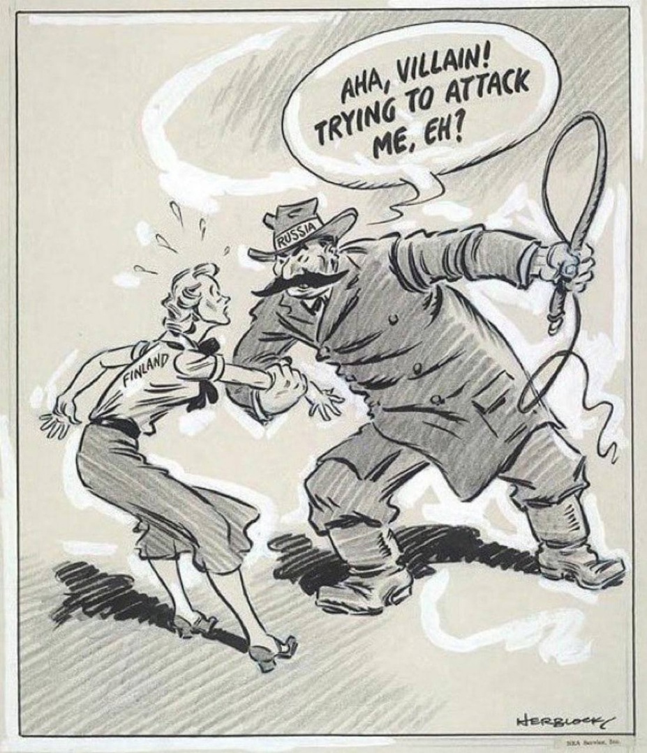 Ещё живы те финские дети которых бомбили советские военные самолёты а Министр Иностранных Дел СССР Молотов врал в Лиге Наций что СССР с самолётов сбрасывает не бомбы а корзины с хлебом голодающему финскому пролетариату . Вступление Финляндии в НАТО это не тезис а стратегия безопасности Финляндской Республики в ответ на агрессивные войны с соседними государствами которые беспричинно начала Российская Федерация А вовсе не за боязни угрозы что Эстония и Швеция с Норвегией нападут на Суоми .