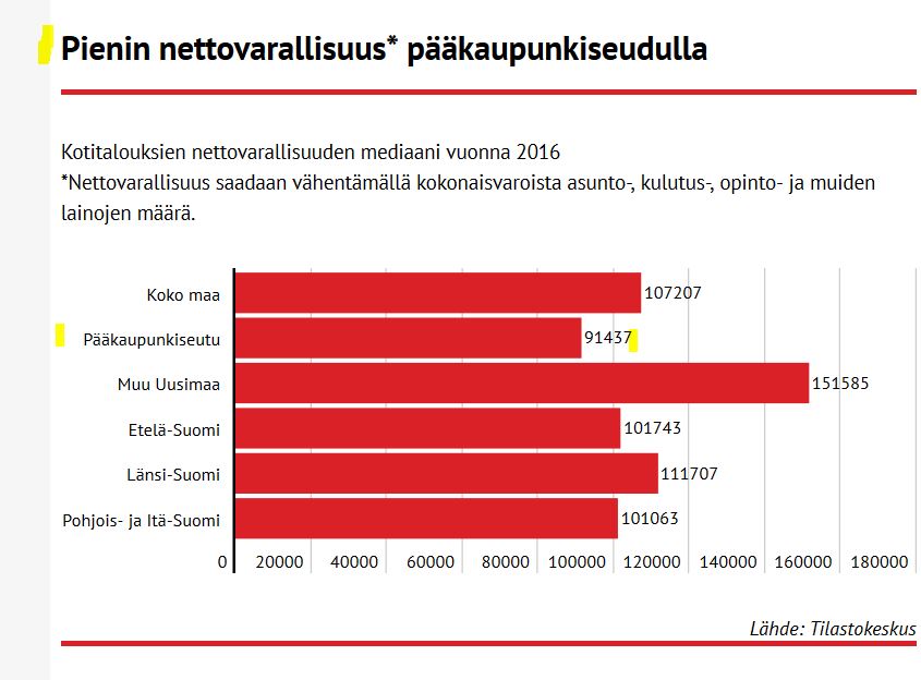 "Pääkaupunkiseudulla asuvat ovat nettovarakkuuden mediaanilla mitattuna muita suomalaisia köyhempiä"