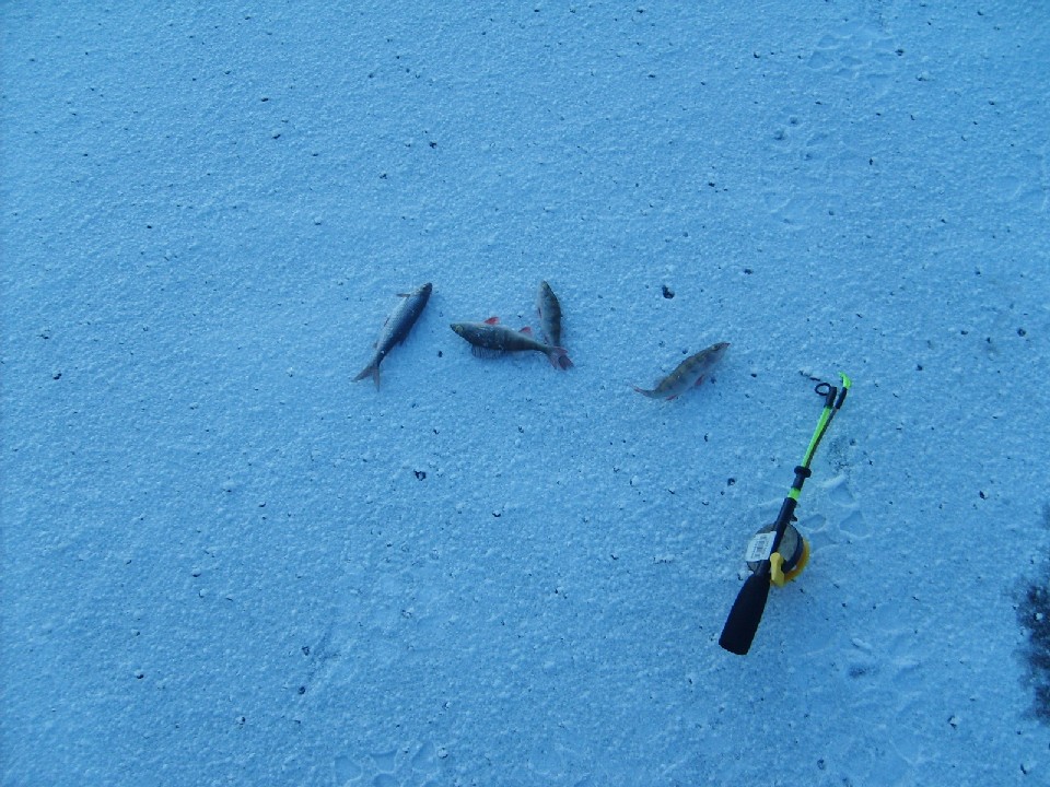 три дня сверлил и бурил... ночью заяц местный приходил, осматривал мои лунки...хорошо хоть снег не поджелтил)))) короче, три дня....в самые лютые морозы...от 14 - 18 до 20... вода в лунках встает сразу... опарыш сволачь по дороге окуклился....мотыль - на морозе с ним непросто.... короче....что вы думаете? размер в руках принимать будете?)))