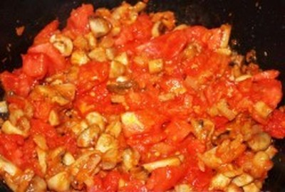 К грибам добавить нарезанный лук и продолжать жарить грибы и лук вместе, пока лук не станет золотистым.В грибы и лук высыпать муку, все перемешать и еще 2-3 минуты потушит.К грибам добавить нарезанные помидоры, все перемешать и оставить томиться на маленьком огне, помешивая, не давая пригореть. При этом томатный сок будет густеть. Когда сок загустеет достаточно по вашему вкусу или выпарится вообще, тогда сковороду снять с огня. Готовое блюдо приправить солью и перцем.При подаче посыпать нарезанной зеленью