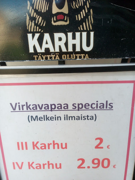 Замечание. Сидел смотрел, считал, наблюдал. На выпивку есть какое определённое количество денег. Дешевле или дороже, но деньги одинаковые. Я пробовал добавить летом муйкку с пюре картофельным... Муйкка забирала деньги на пиво... Общий приход в маленьком городке может увеличиться только за счет туриста. Нет туриста, приход денег одинаковый, хоть по 1 евро продавай.