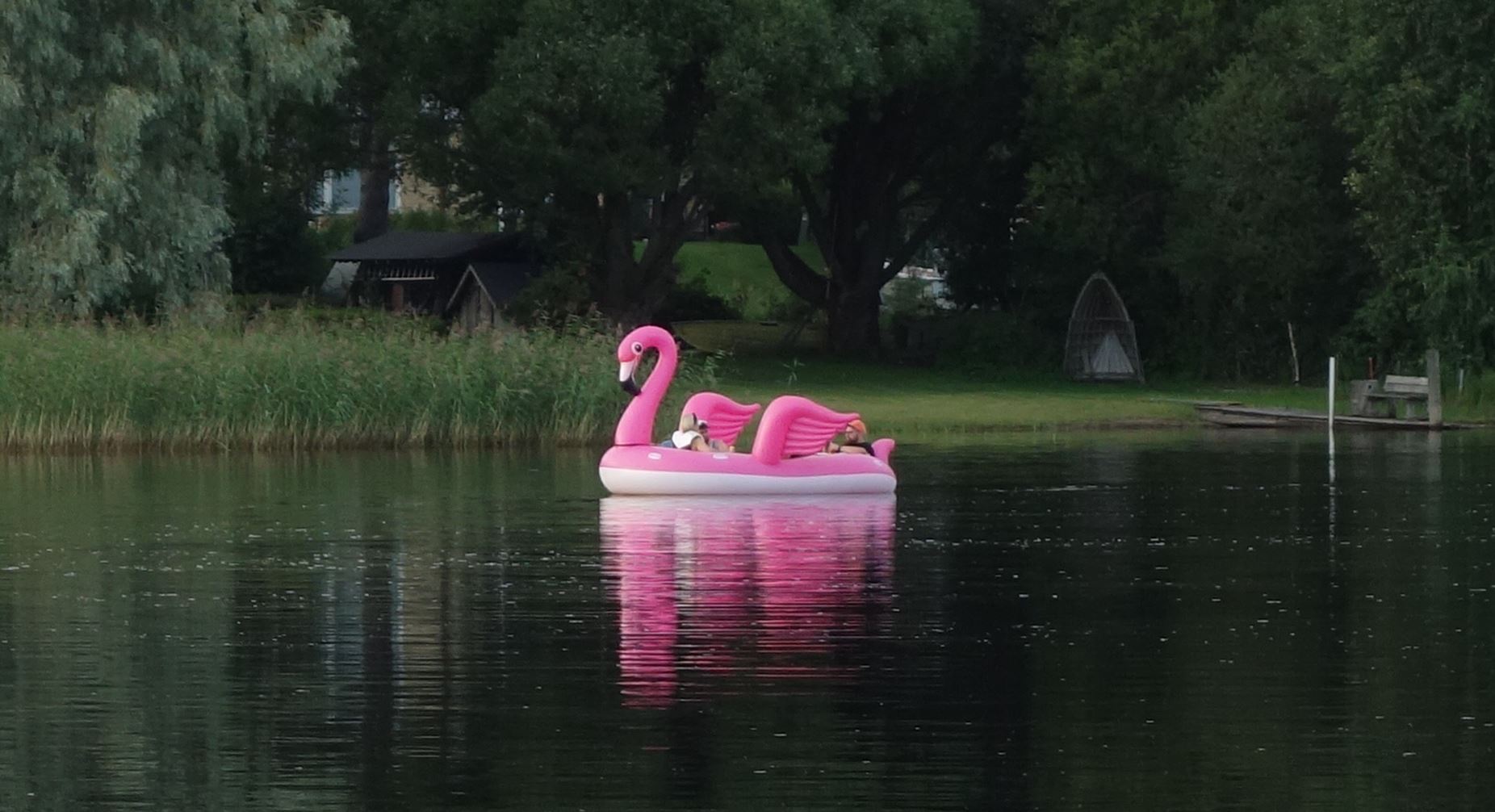 Например, несколько дней тому назад катались по реке - глядь, лодка-фламинго с тремя чудаками плывёт,