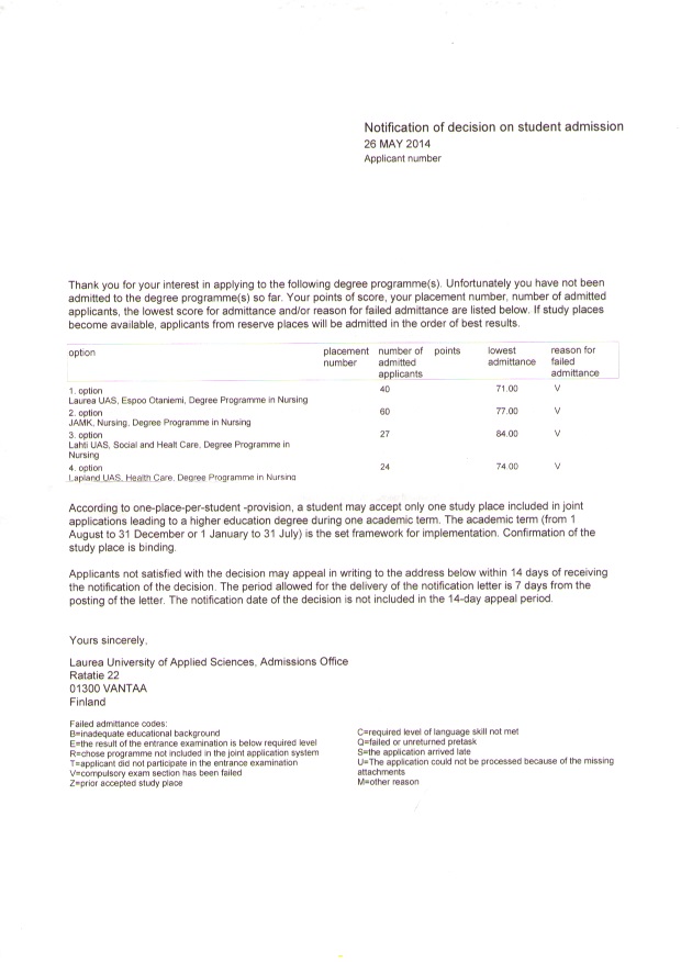 Присоединяюсь к поздравлениям поступивших Вы – молодцы! Не забудьте как можно скорее подать заявление на место в общежитии, а то в Финляндии с этим делом туго.