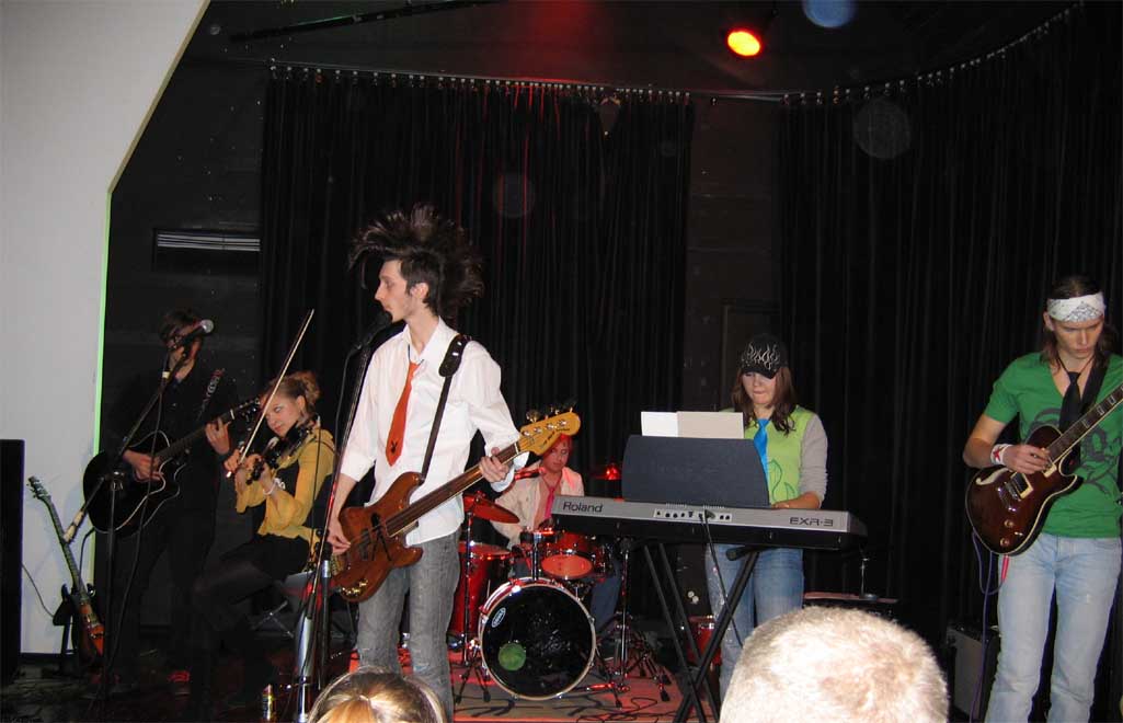 Что до нашего выступления - судить не могу. Говорили, что сыграли лучше, чем первый концерт, но не было толком слышно вокала. Думаю, всё же больше из-за аппаратуры, ибо играли фактически на своём репетиционном оборудовании, которое для выступлений даже в маленьких залах слабовато... По этой же причине получилось так, что ударник (Lizzie) не слышал ничего кроме баса, и играл фактически в глухую по памяти. Да ещё и со сломанной рукой. Тем не менее отыграл отлично, за что ему зачОт. (%