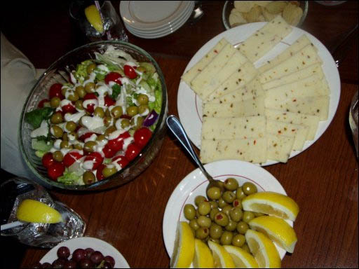 Вот вам пока салатики на закуску. Напиточки в баре возьмите.