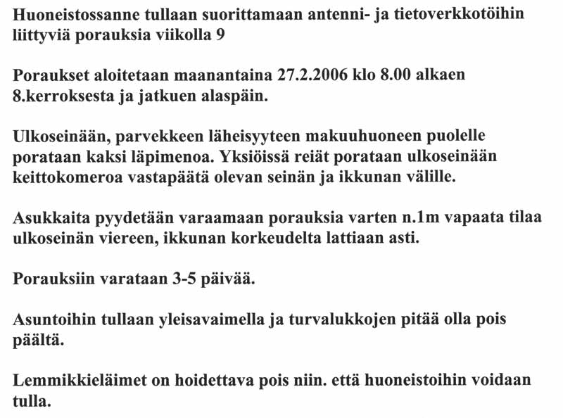 У нас тут в доме катаклизмы начались - ремонт и все такое. Периодически присылают разные бумажки. В целом мы с супругой суть понимаем, но вот нюансы... Поэтому очень прошу помощи в переводе письма в прикрепленной картинке. Причем именно с подробностями. Суть понятна - нужно освободить 1 метр от внешних стен, придут сверлить. А вот подробности непонятны - от всех внешних (уличных) стен или только с окнами? Занавески снимать? И т.п.