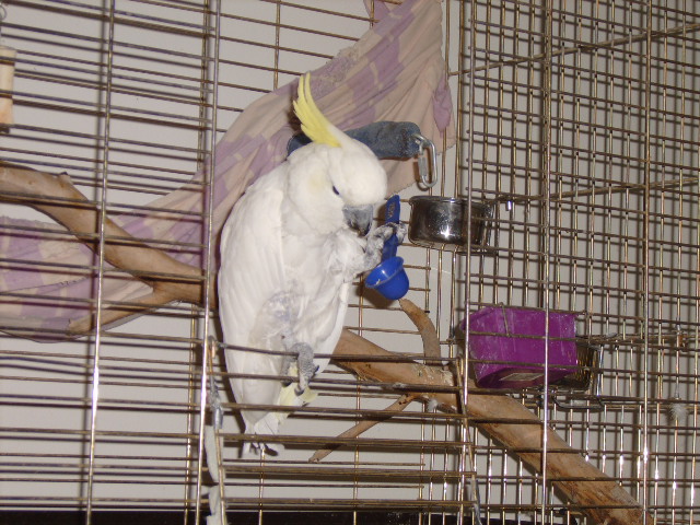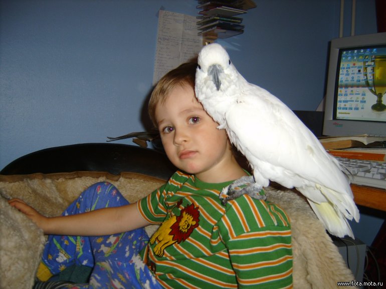 По приезду она хотела его оставить у нас навсегда, я была бы и рада, но от попугая было очень много грязи, особенно перхоти - у нас вся мебель вблизи клетки покрывалась белым налётом со скоростью света, также, погладив и наобнимавшись с птицей, невозможно было выйти на улицу в этой же одежде (большой минус для больших попугаев, аллергикам не подходит).
